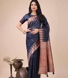 Navy blue color solid zari woven linen cotton saree