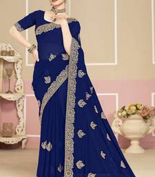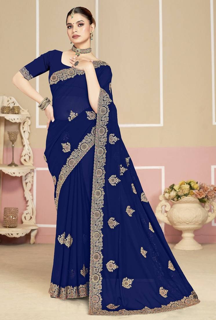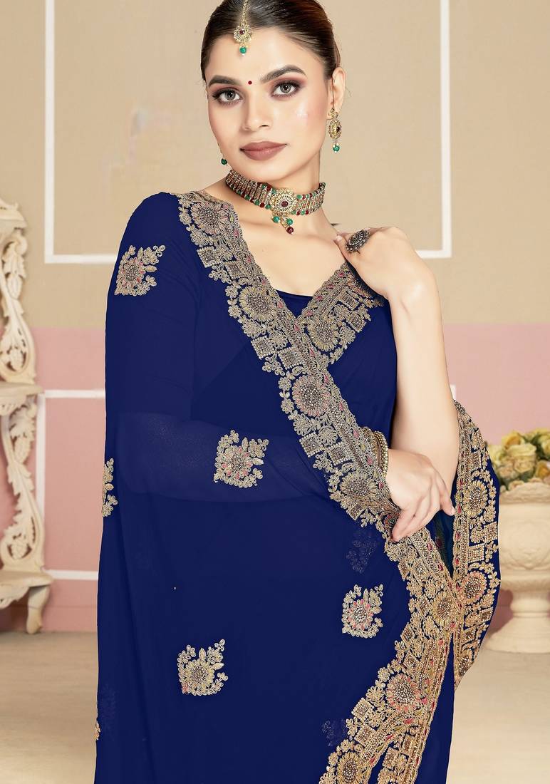 Navy blue color zirkon work & codding embroidered georgette saree with blouse