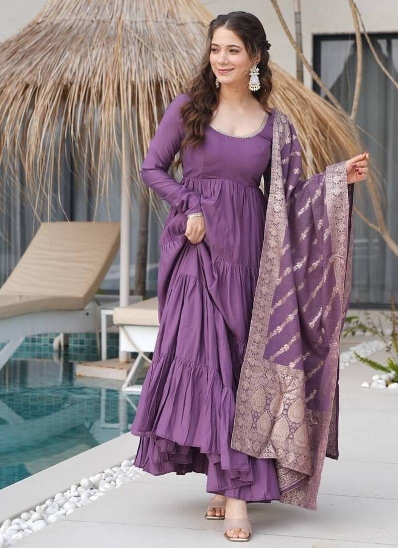 Onion color solid romansilk chanderi anarkali set stitched