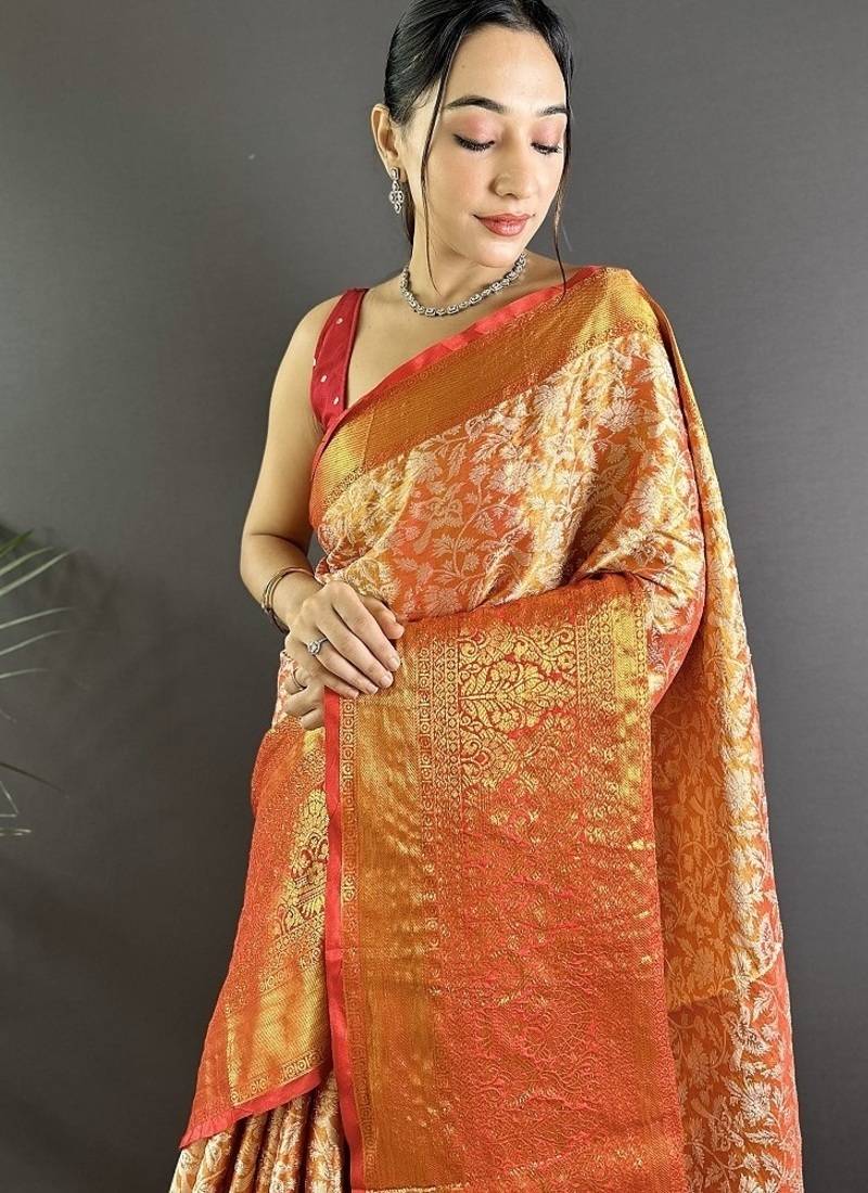 Product Name Orange Color Zari Weaving Work Kanjivaram Tissue Art Silk Saree