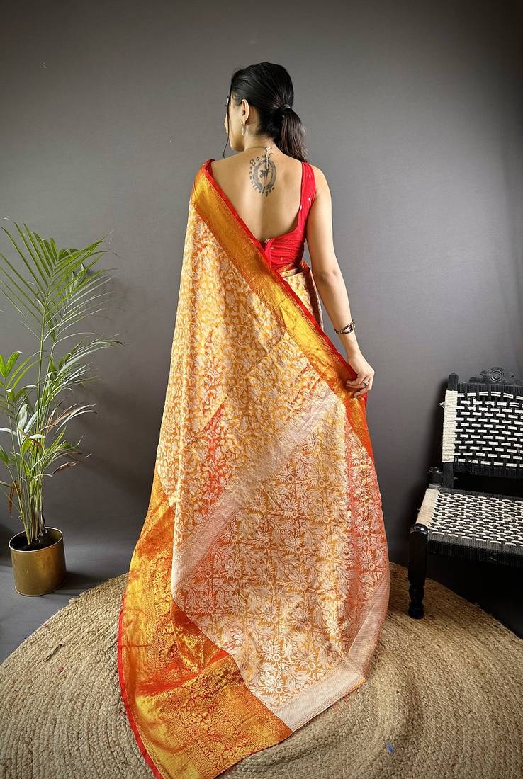 Orange color zari weaving work kanjivaram tissue art silk saree