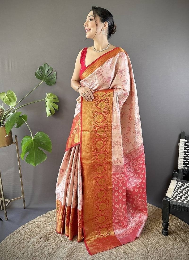 | Product Name | Orange & Red Color Woven Zari Work Kanjivaram Tissue Art Silk Saree | |