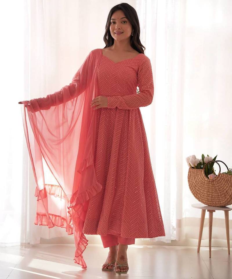 Peach color lucknowi sequince thread work faux georgette anarkali set stitched