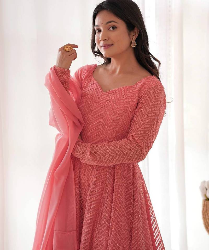 Product Name Peach Color Lucknowi Sequince Thread Work Faux Georgette Anarkali Set