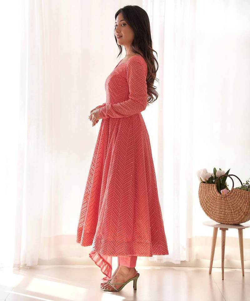 Peach color lucknowi sequince thread work faux georgette anarkali set