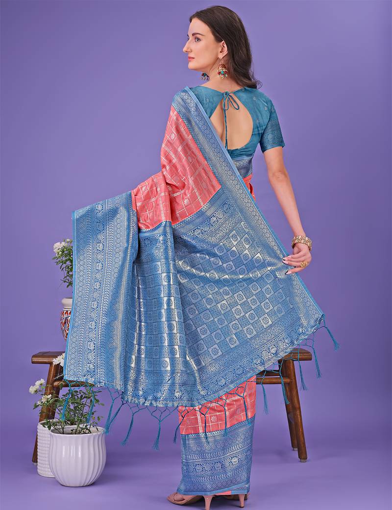 Product Name Peach Color Woven Lichi Art Silk Blend Saree
