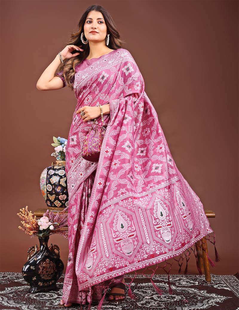 Pink color woven linen cotton saree