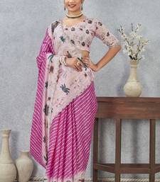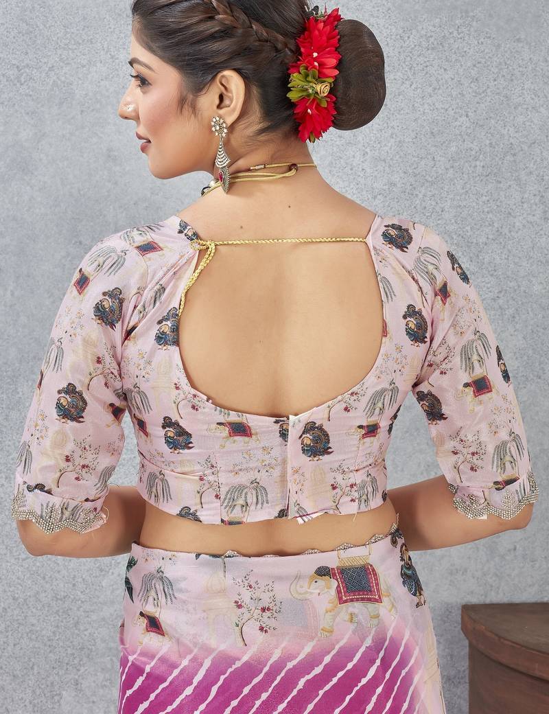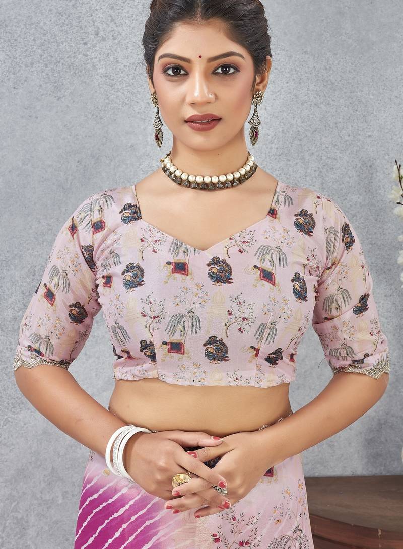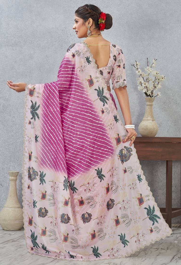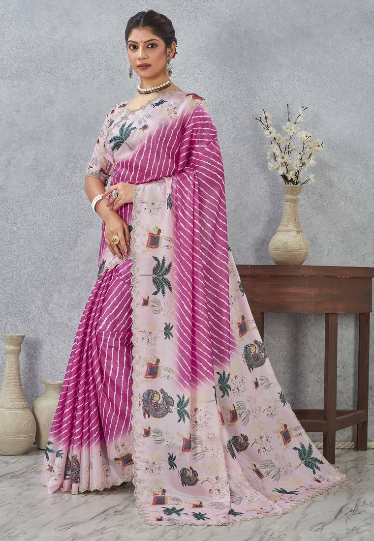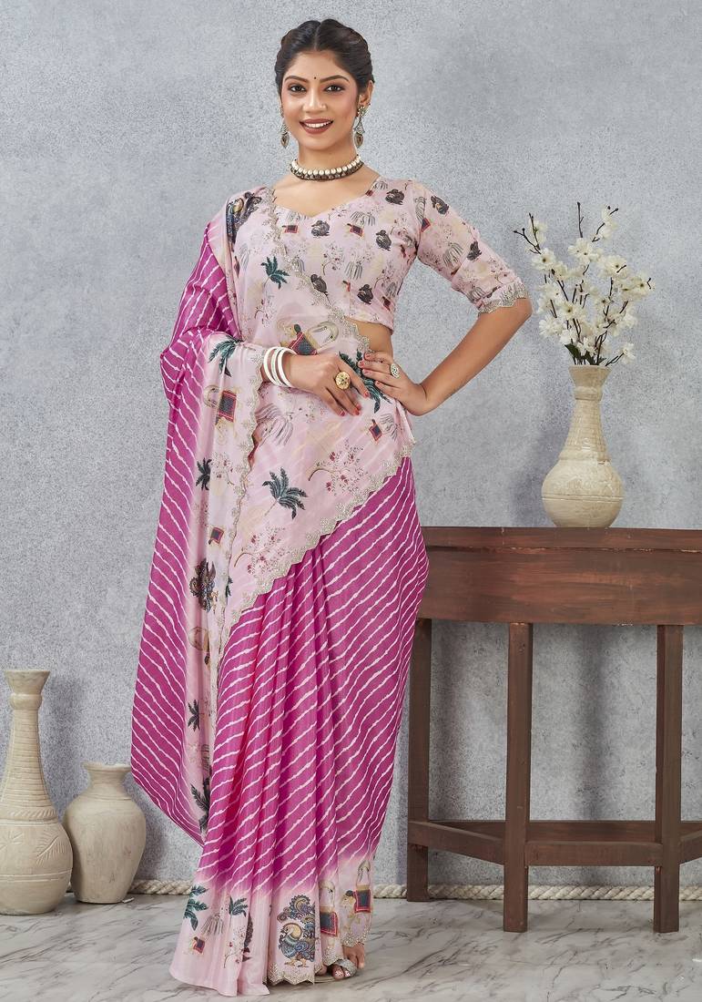 Pink color zirkon cut border worksatin digital printed saree with blouse