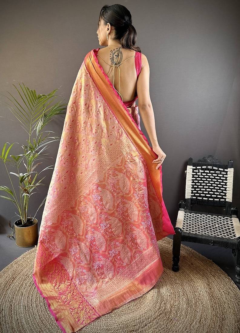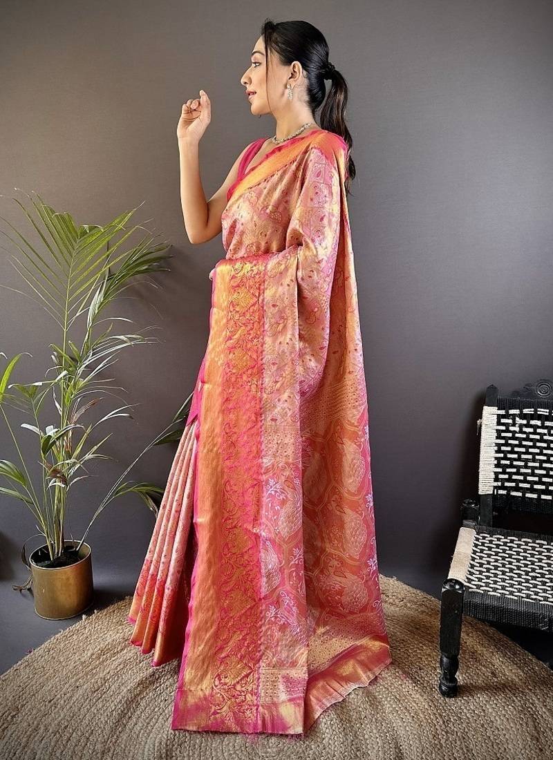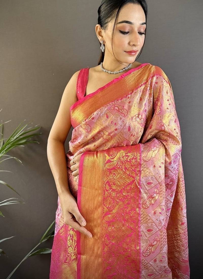 Pink & multicolor color zari weaving work kanjivaram tissue silk saree