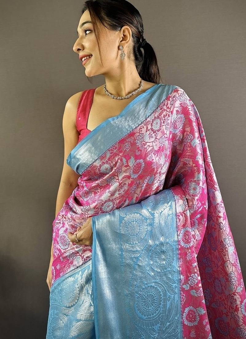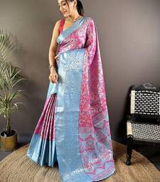 Pink & sky blue color woven zari work kanjivaram tissue art silk saree