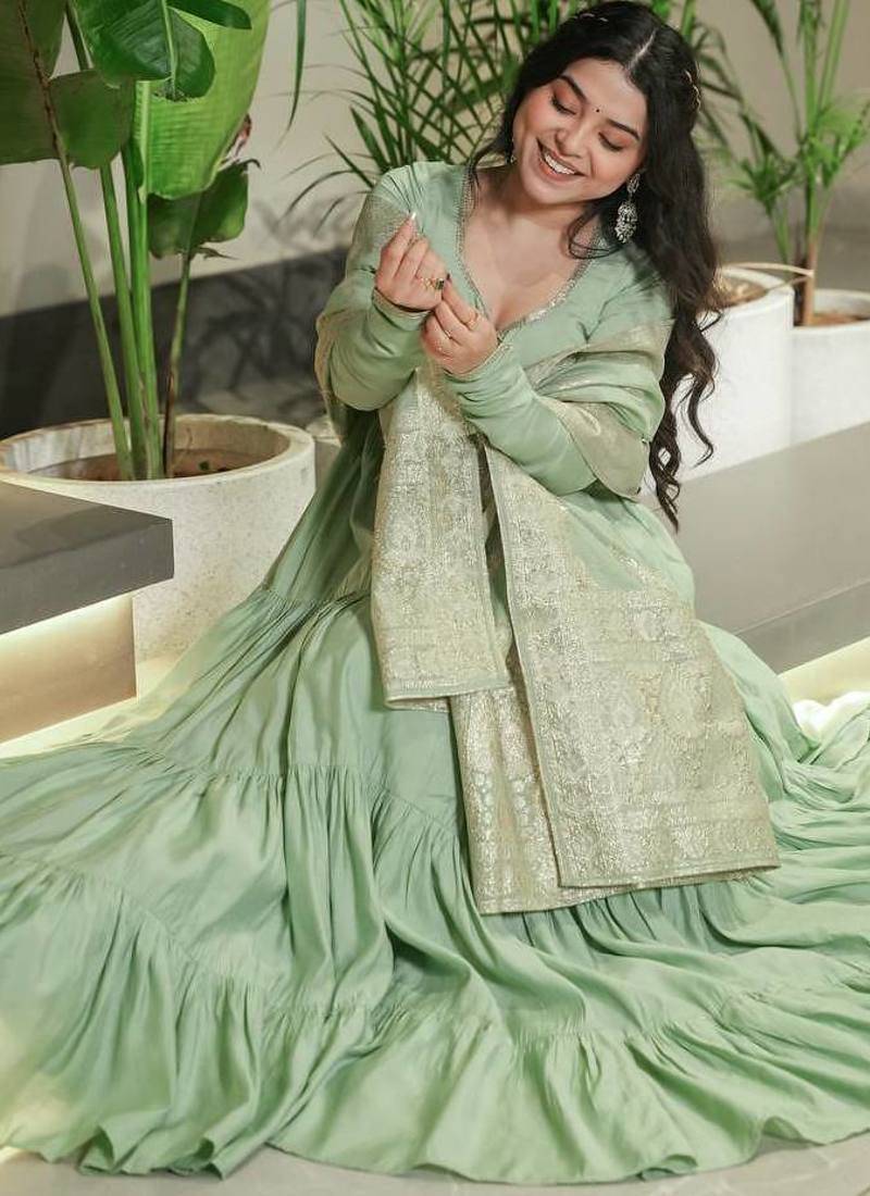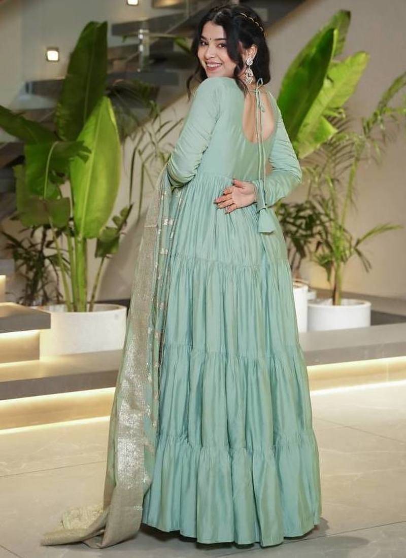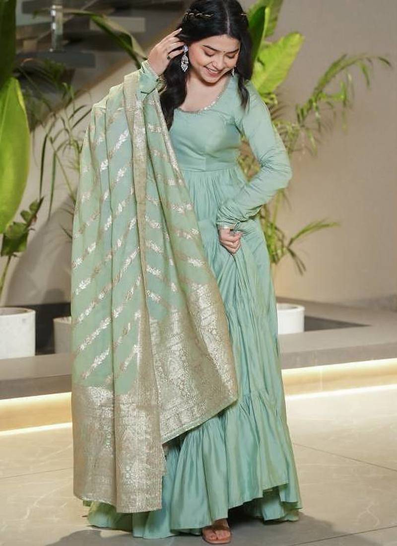 | Product Name | Pista Color Solid Romansilk Chanderi Anarkali Set | |