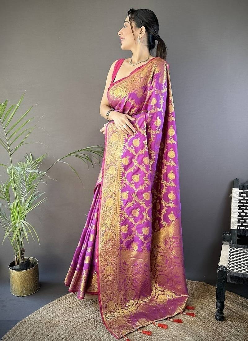 | Product Description | Pradeep Fashion Banarasi Soft Silk Sarees With Flowers Weaves All Over The Body, Having Rich Zari Woven Pallu And Paired With Design Weaving Blouse |