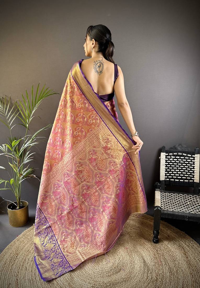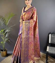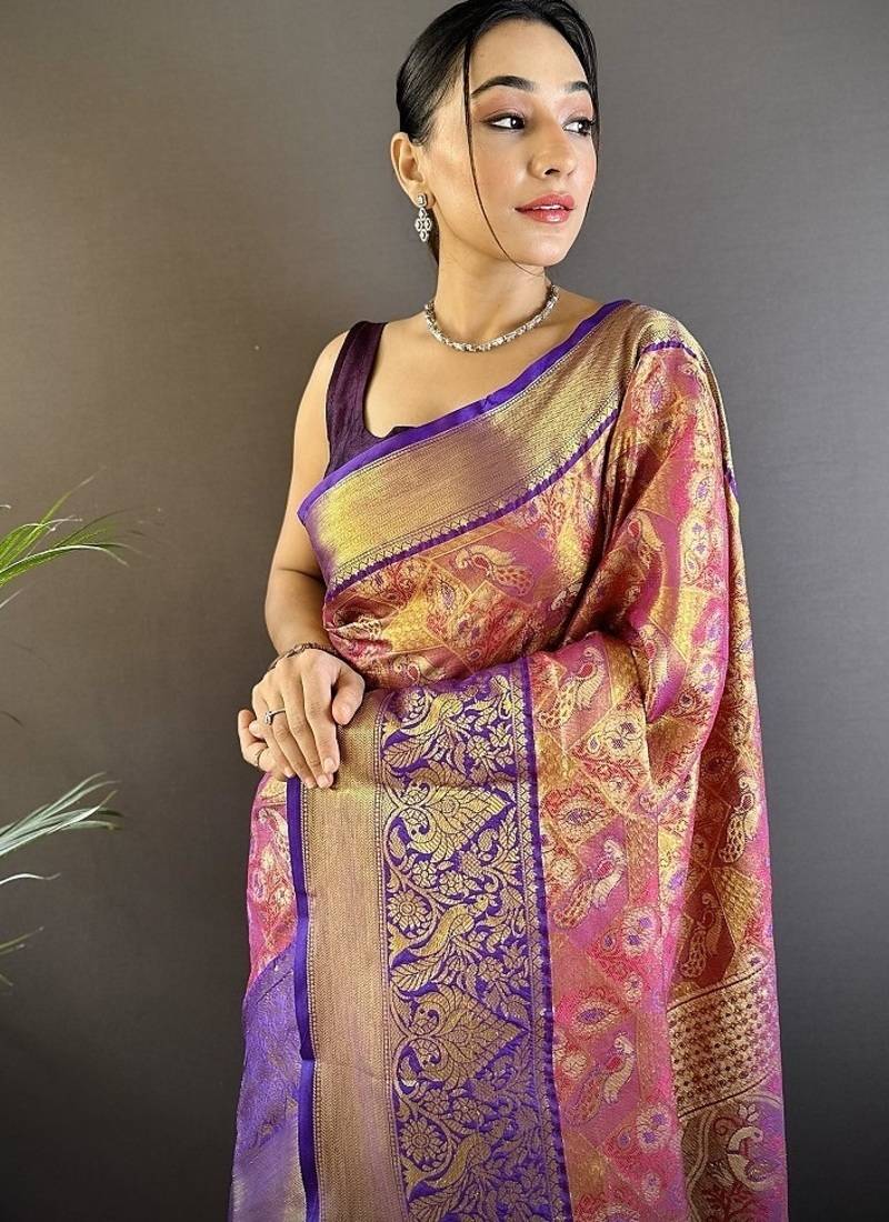 Purple & multicolor color zari weaving work kanjivaram tissue silk saree