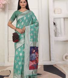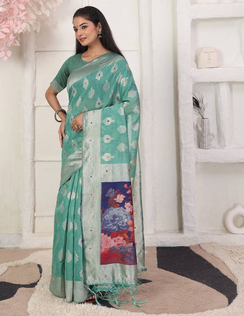 | Product Name | Rama Green Color Woven Linen Cotton Flower & Peacock Pallu Saree | |