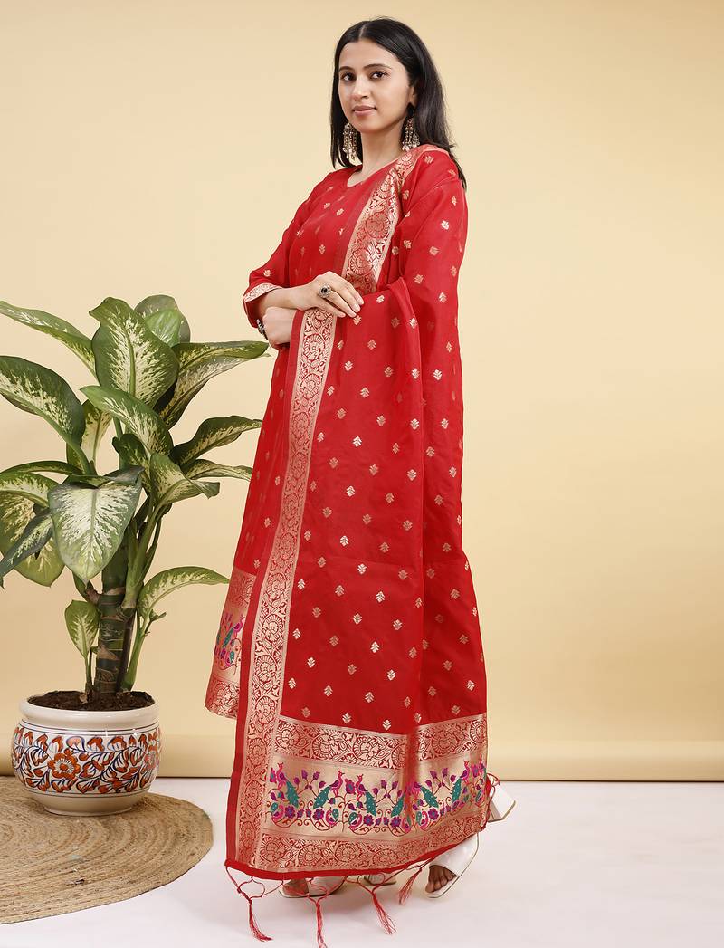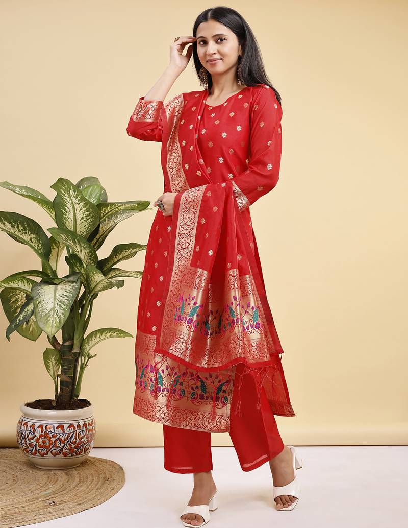 | Product Name | Readymade Red Color Pure Banarasi Silk Top Pent Dupatta Set | |