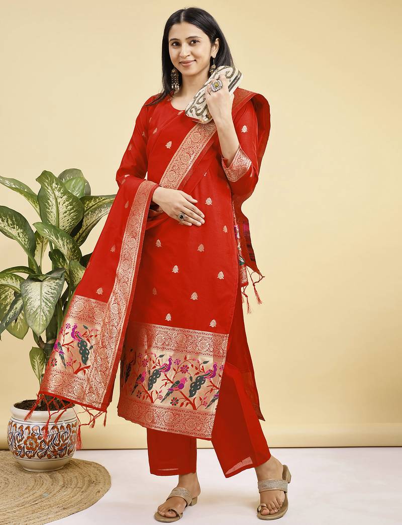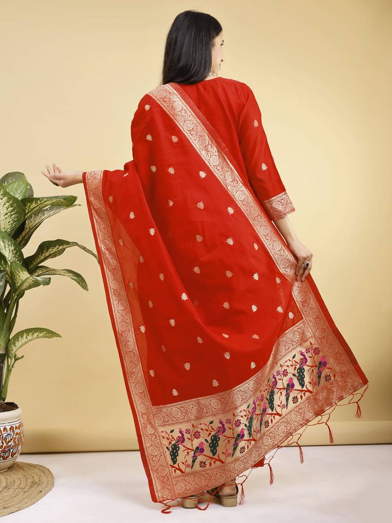 | Product Name | Readymade Red Color Pure Banarasi Silk Top Pent Dupatta Set | |