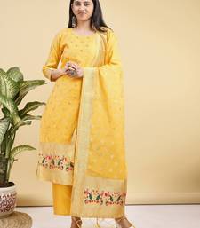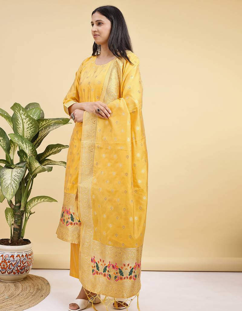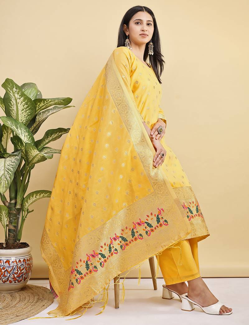 Readymade yellow color pure banarasi silk top pent dupatta set
