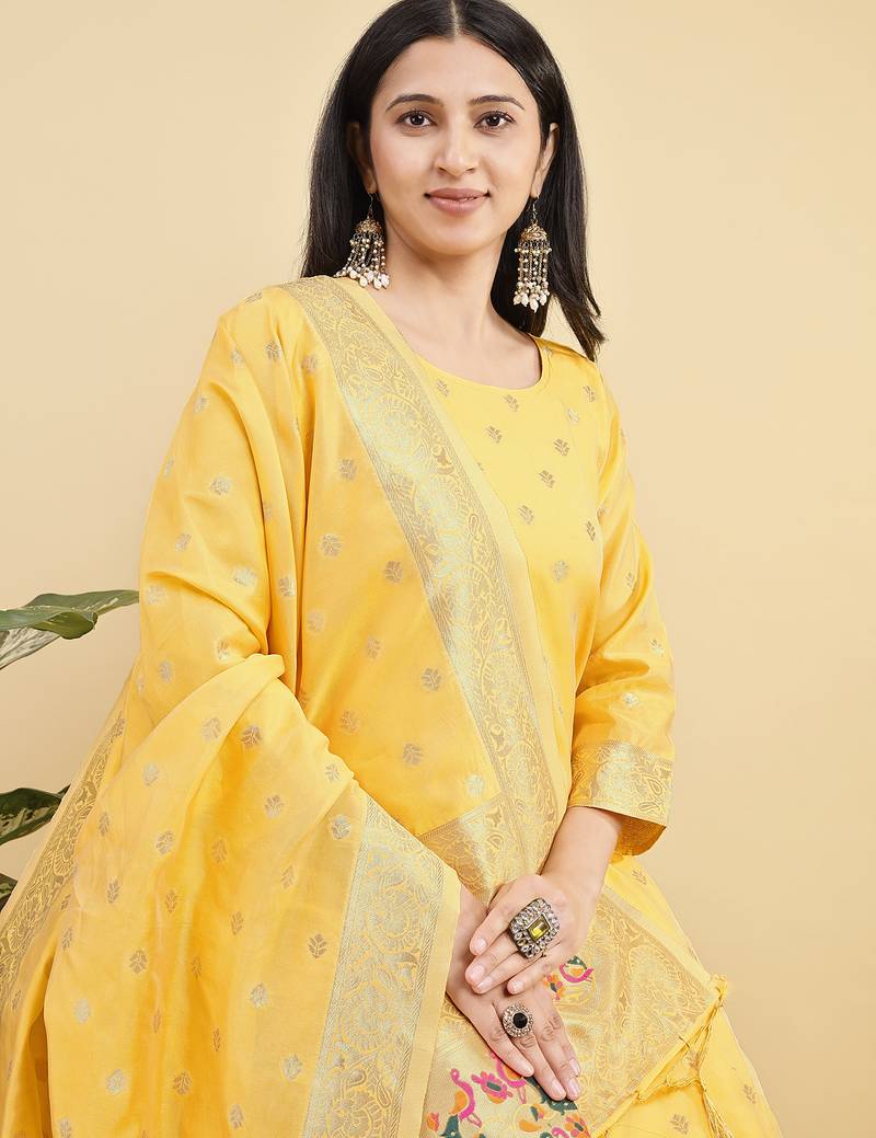 | Product Name | Readymade Yellow Color Pure Banarasi Silk Top Pent Dupatta Set | |
