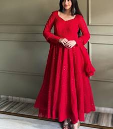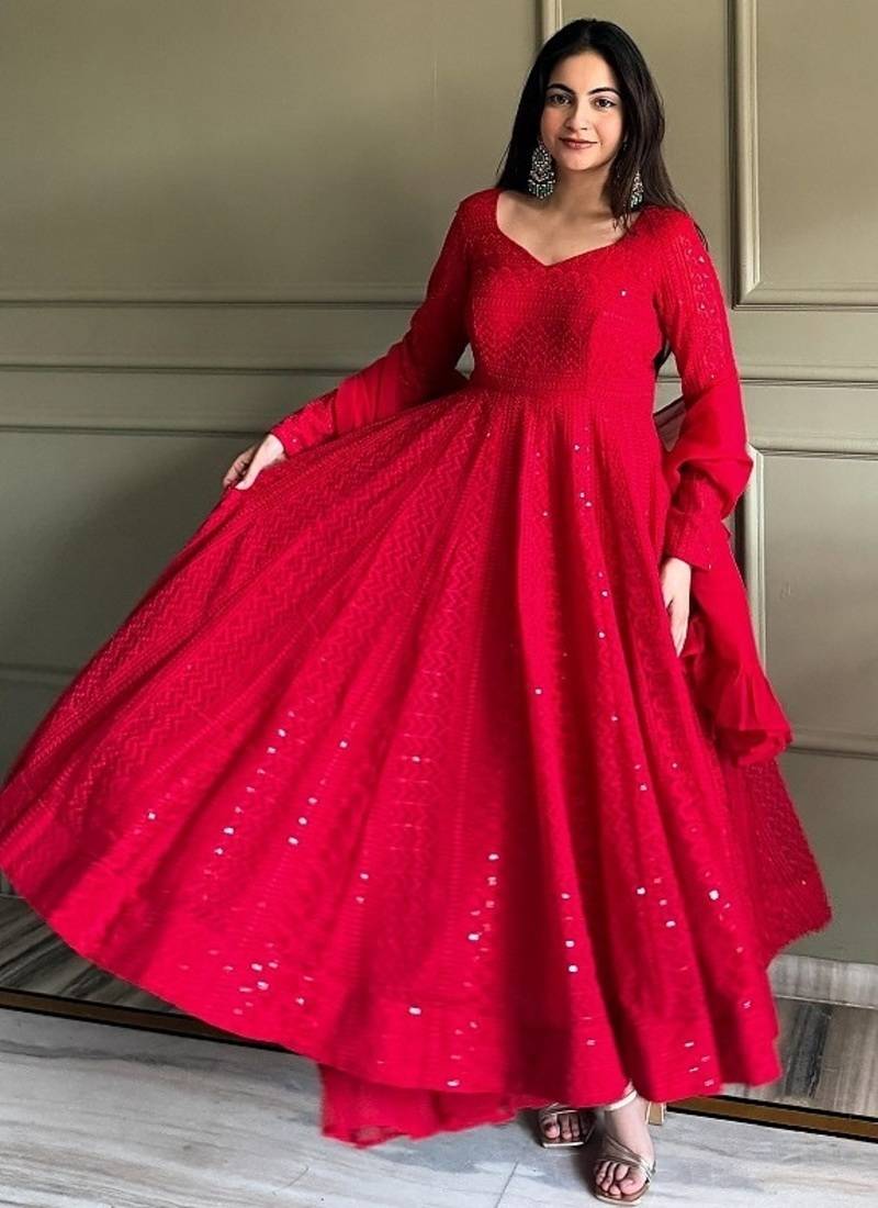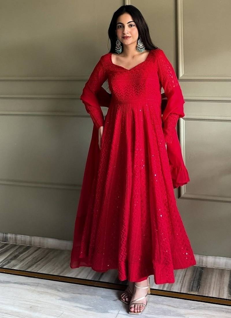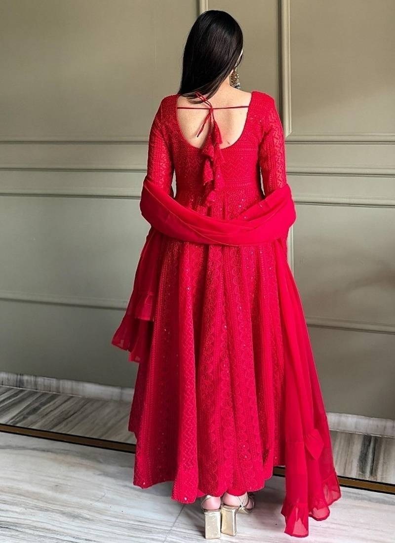 Red color lukhnowi sequence & thread embroidered work foux georgette anarkali set stitched