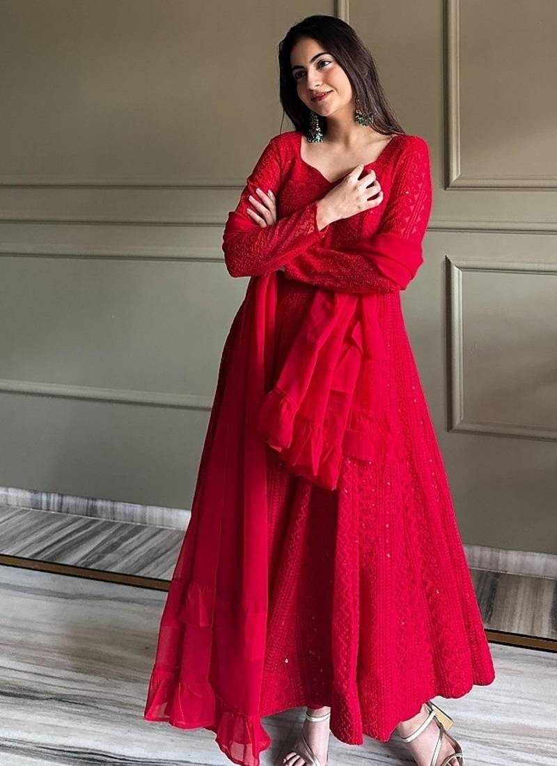| Product Name | Red Color Lukhnowi Sequence & Thread Embroidered Work Foux Georgette Anarkali Set | |