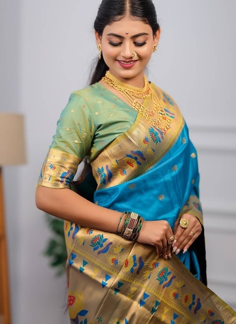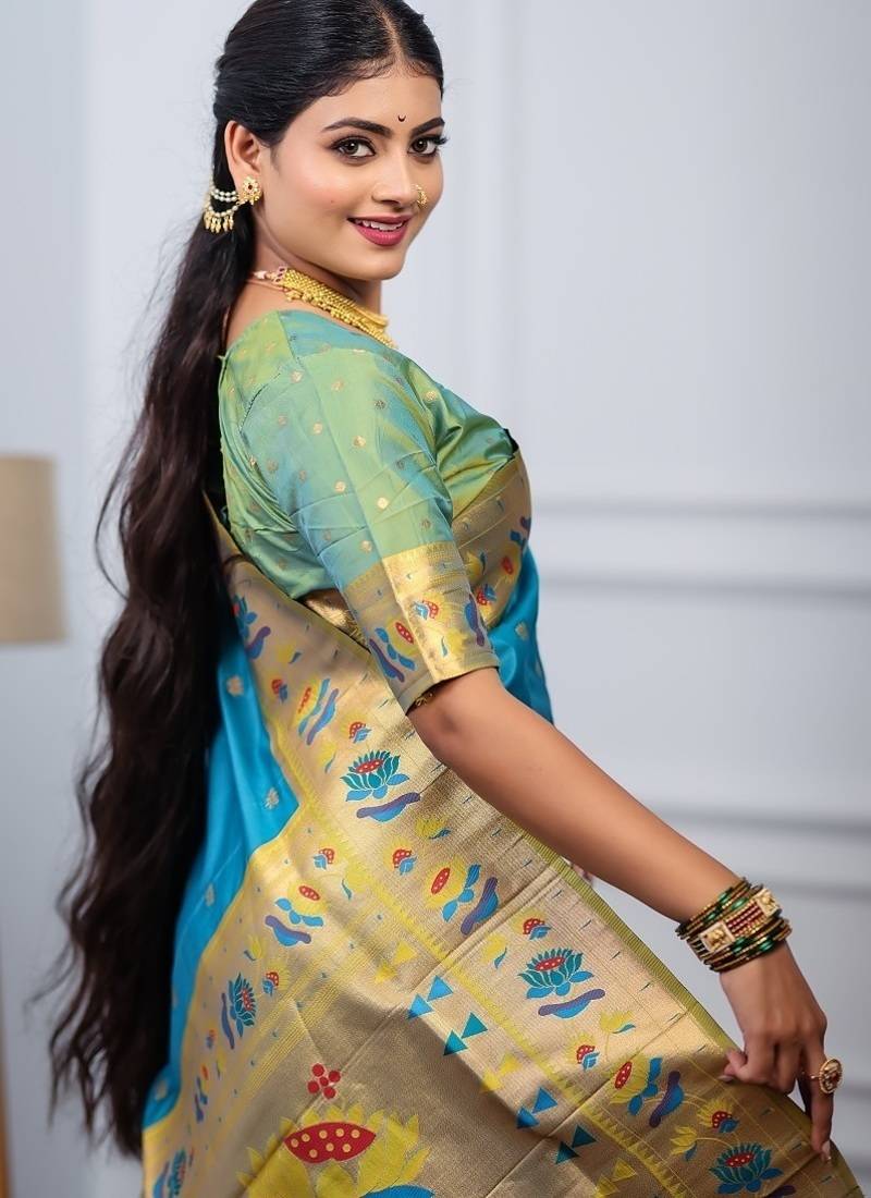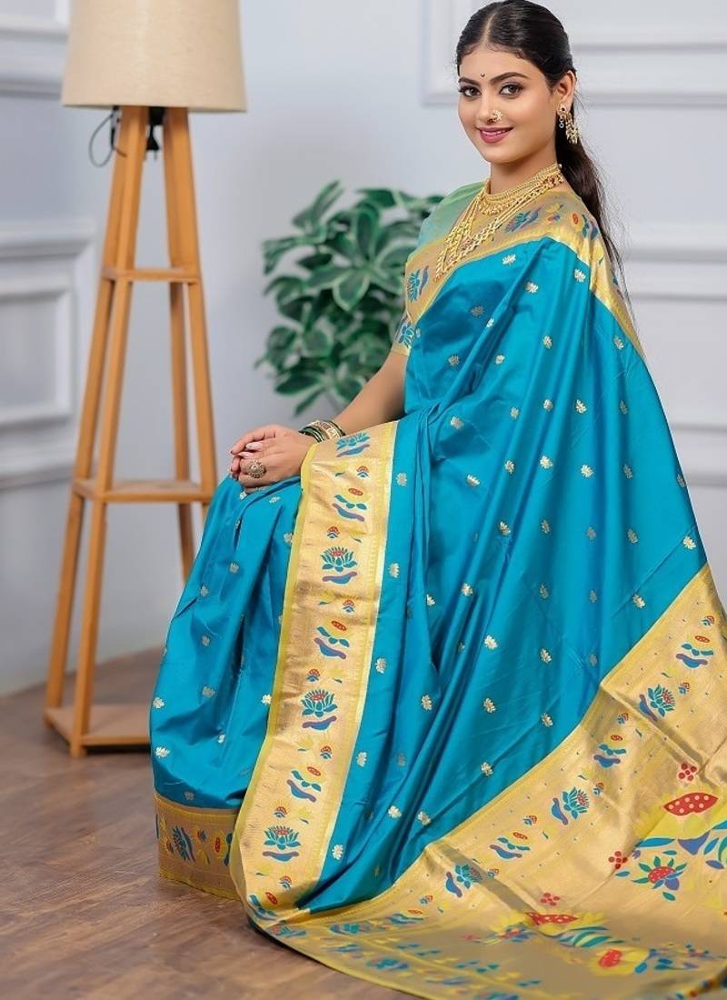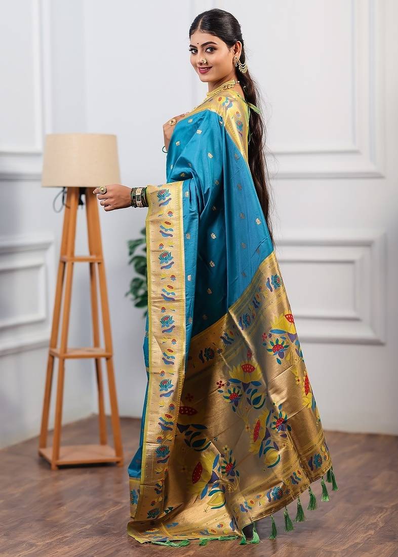 | Product Name | Sky Blue Color Weaving Paithani Gold Copper Zari Weaving Meenakari Border Saree | |