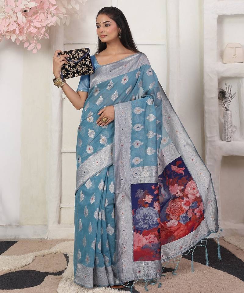 | Product Name | Sky Blue Color Woven Linen Cotton Flower & Peacock Pallu Saree | |