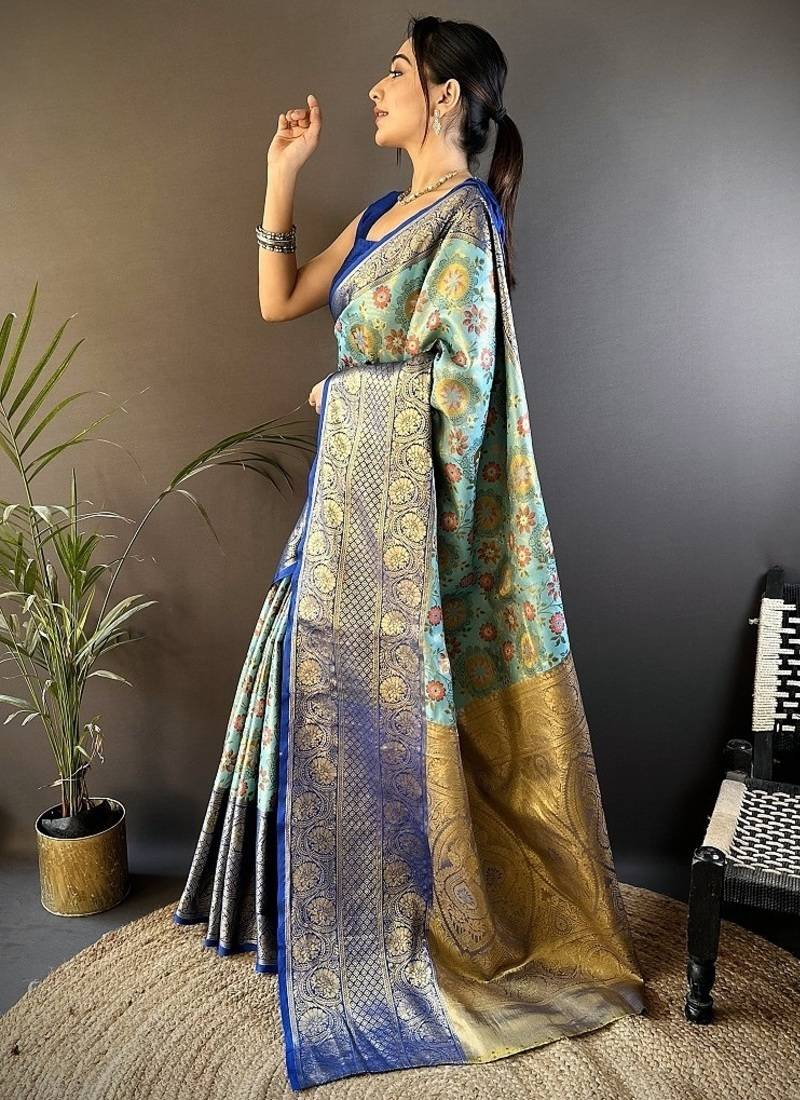Skyblue color jacquard woven kanjivaram tissue art silk work saree