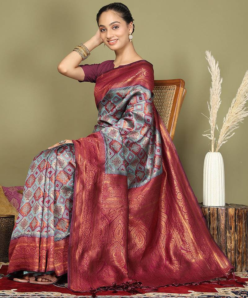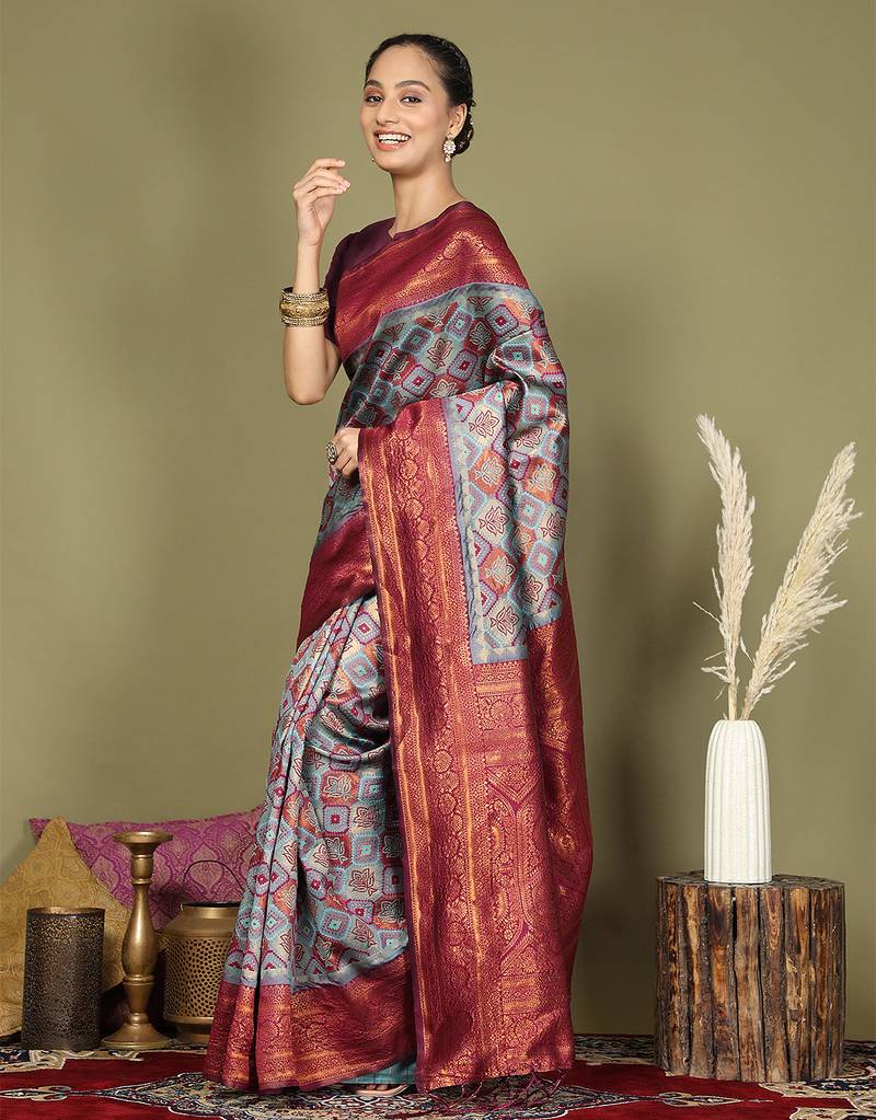 Maroon color woven lichi art silk blend saree with blouse