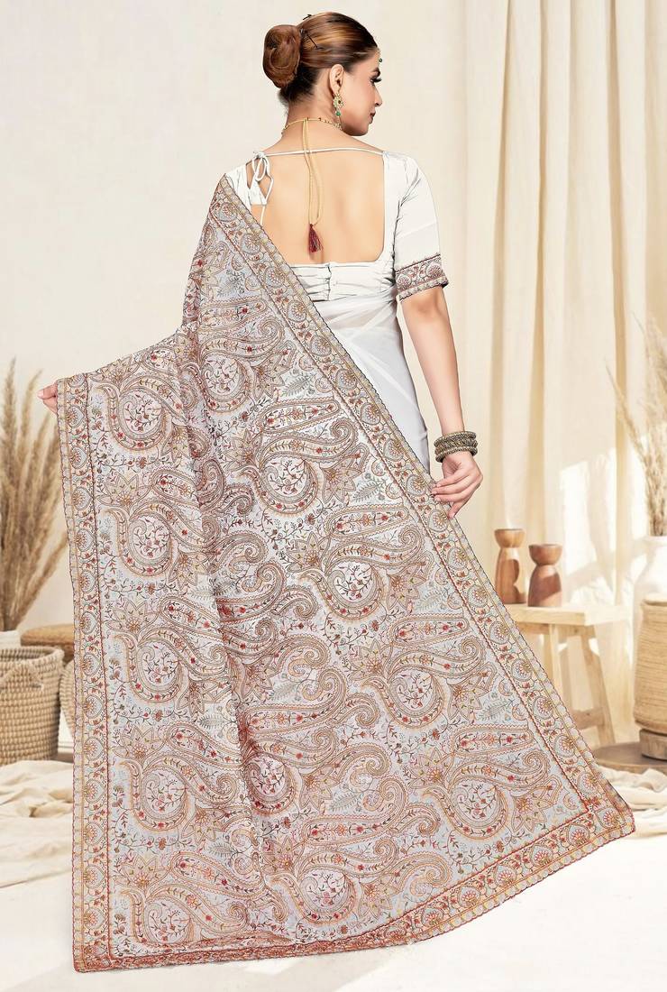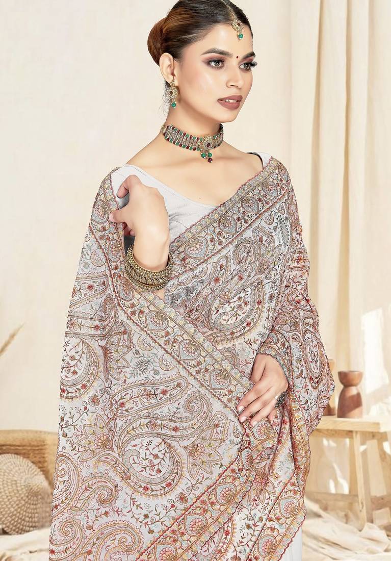 Product Name | White Color Resham Multi Kashmiri Embroidery Work Saree With Blouse | |