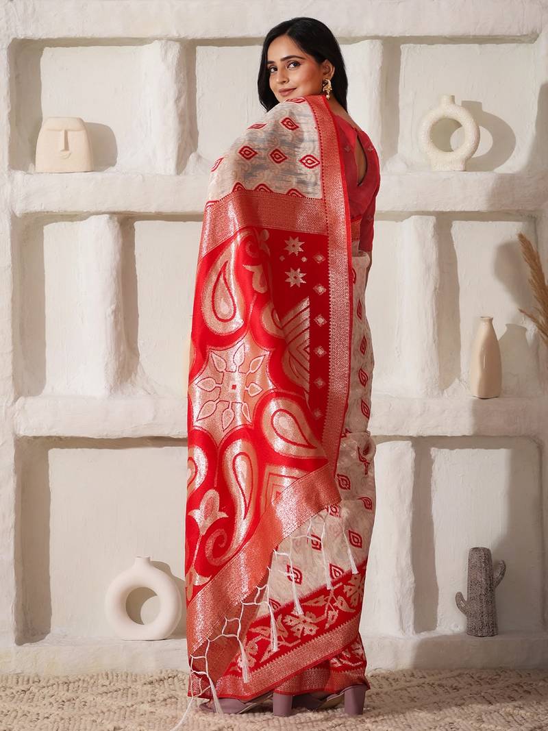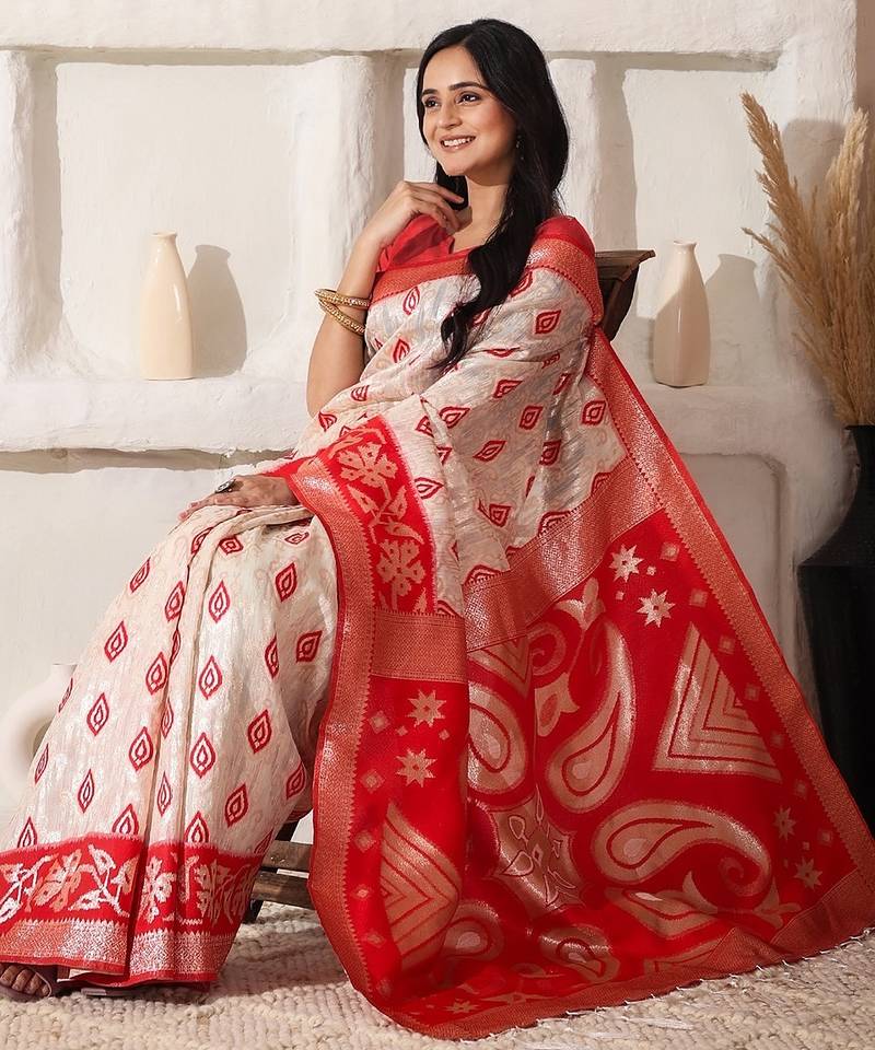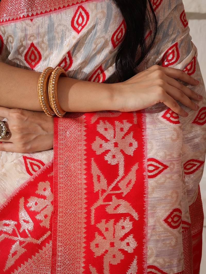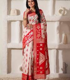 White & red color zari woven linen cotton art silk saree
