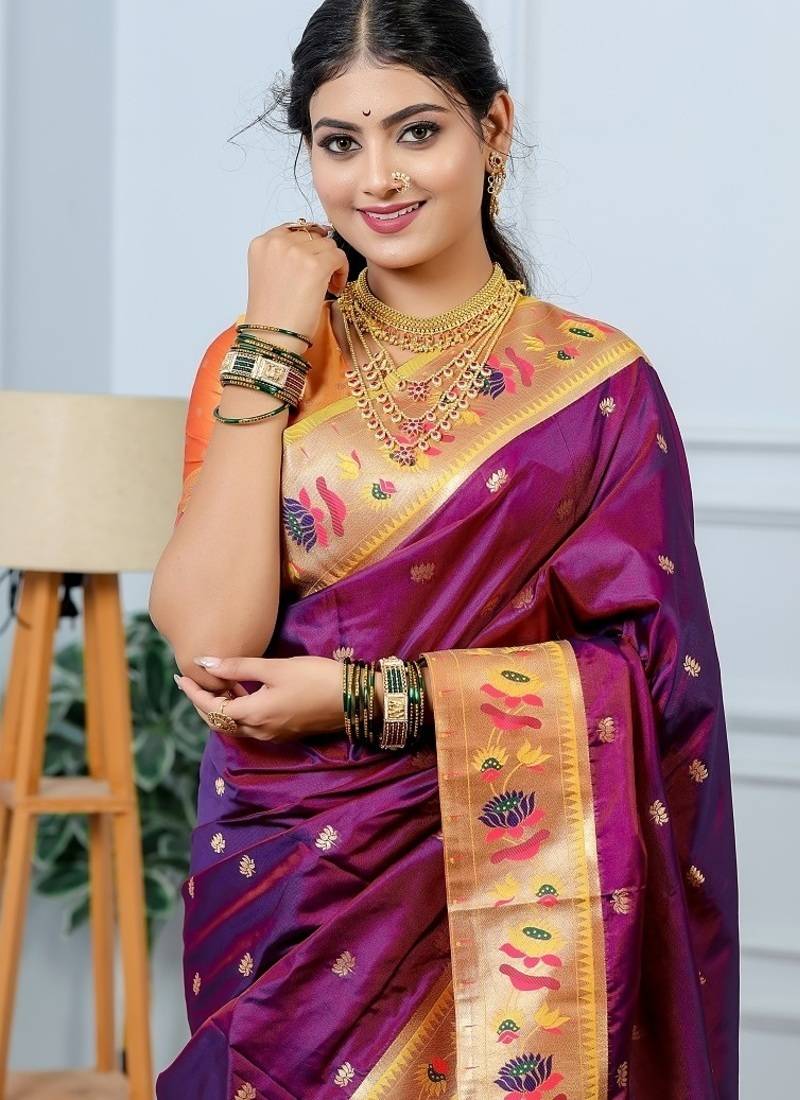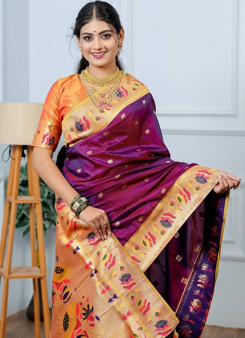 | Product Description | Pradeep Fashion Premium Pure Soft Silk Fabric Weaving Lotus Pethani Saree Pure Gold Copper Zari Weaving Lotus Pallu Meenakari Lotus Border Sari With Brocade Zari Blouse |