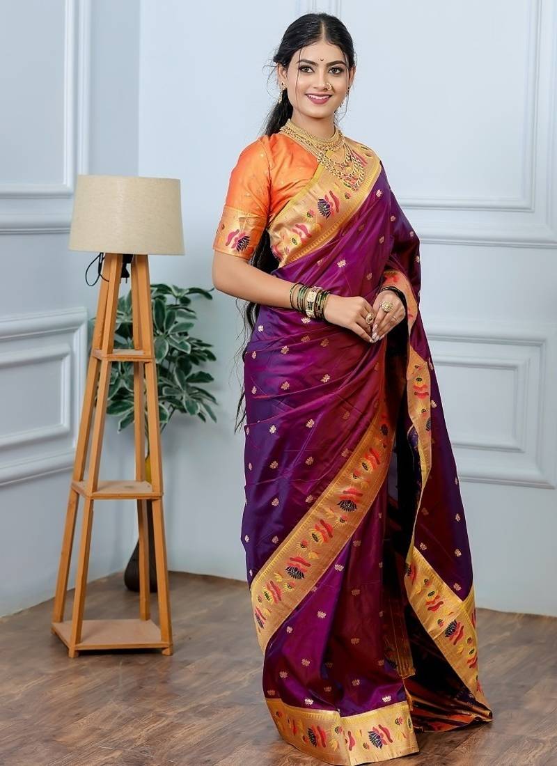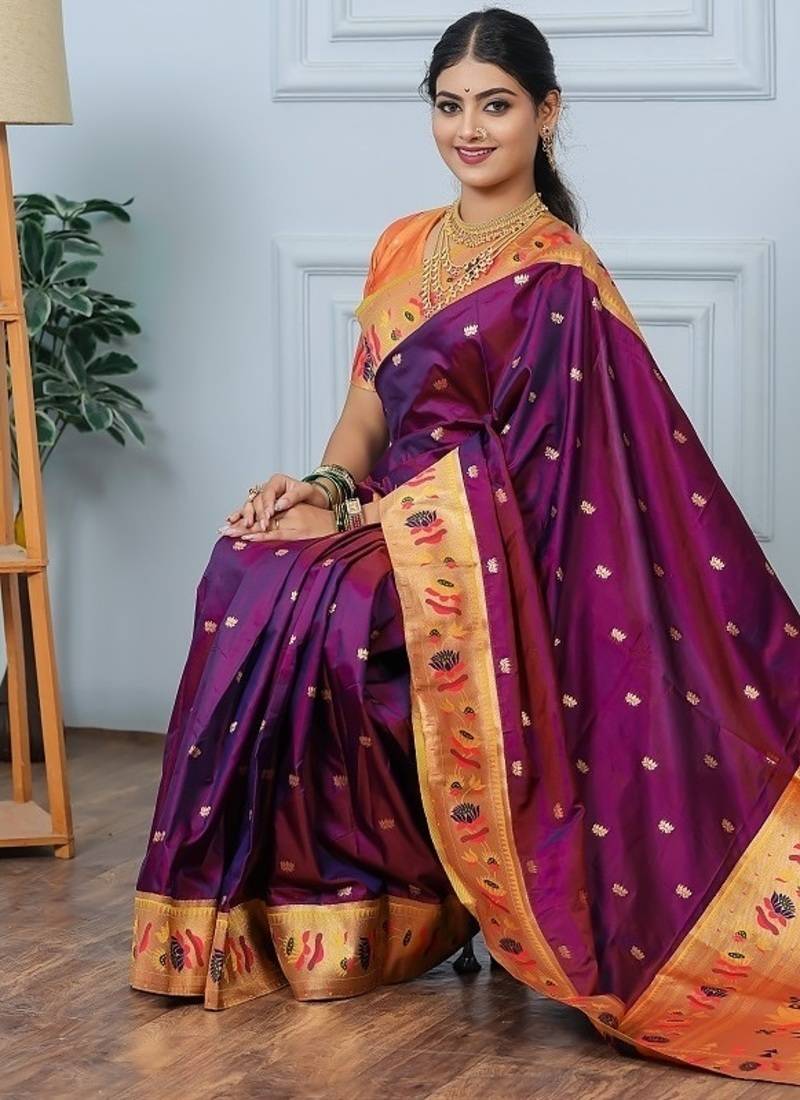 | Product Name | Wine Color Weaving Paithani Gold Copper Zari Weaving Meenakari Border Saree | |