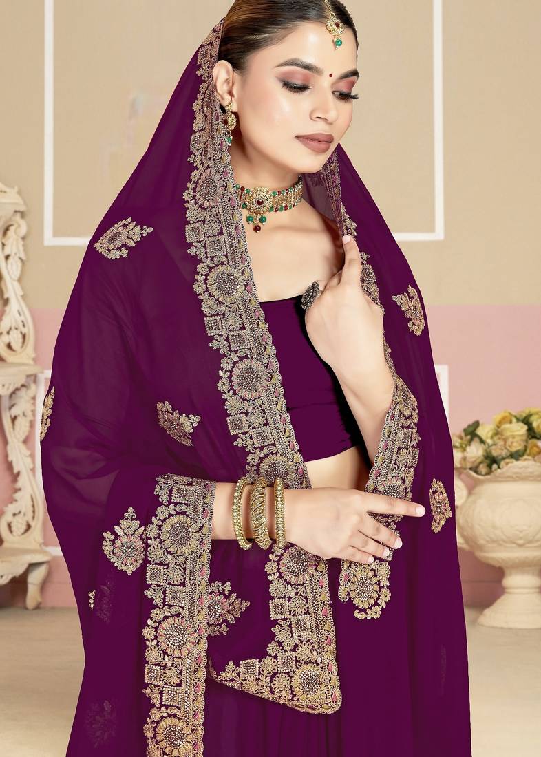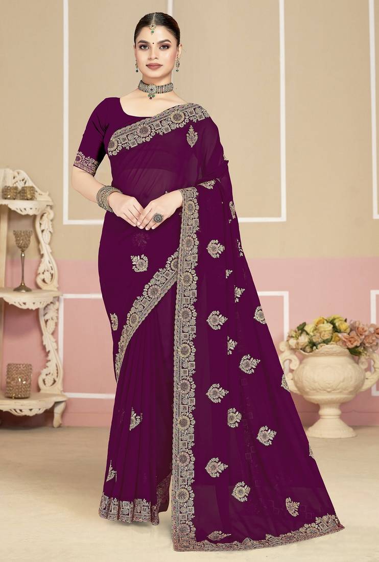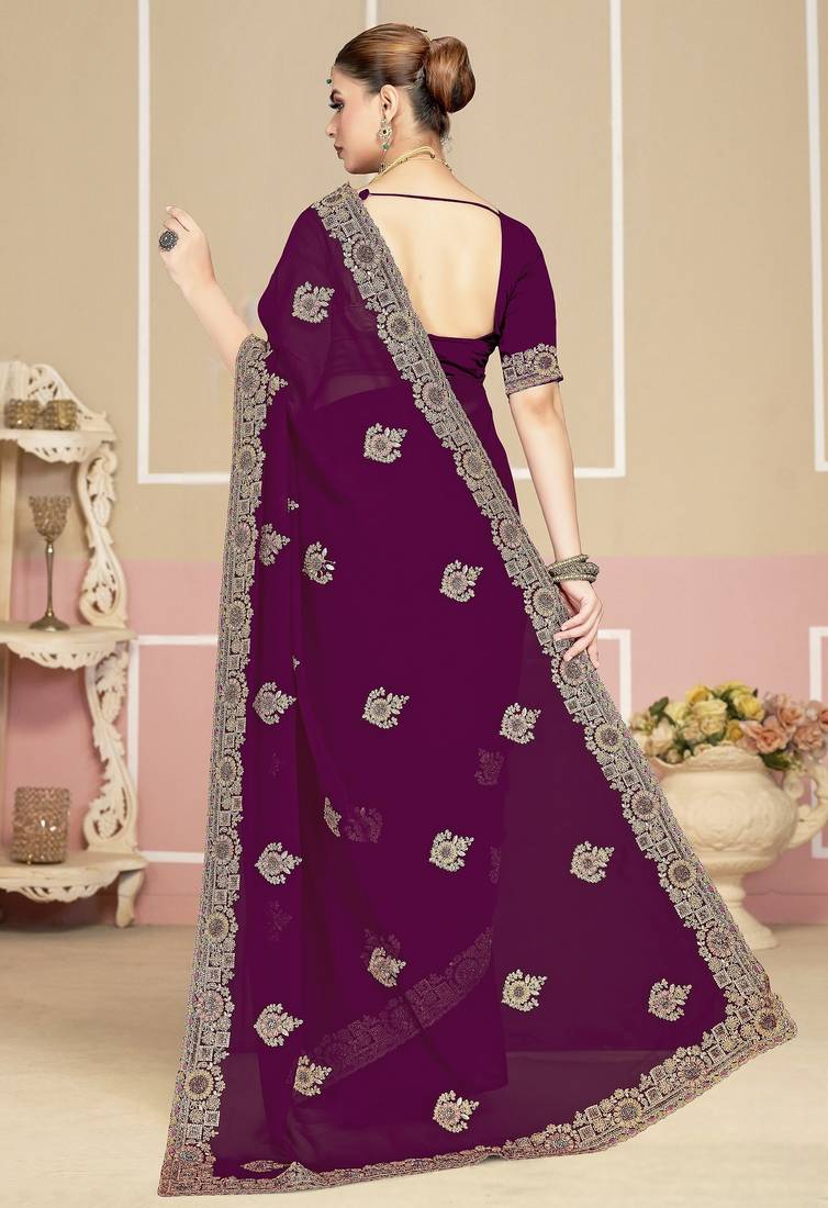 Wine color zirkon work & codding embroidered georgette saree with blouse