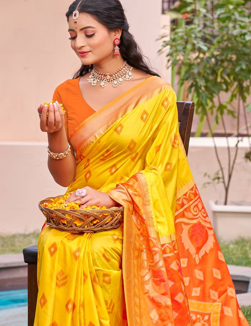 | Product Name | Yellow Color Pochampally Silk Blend Weaving Work Saree | |