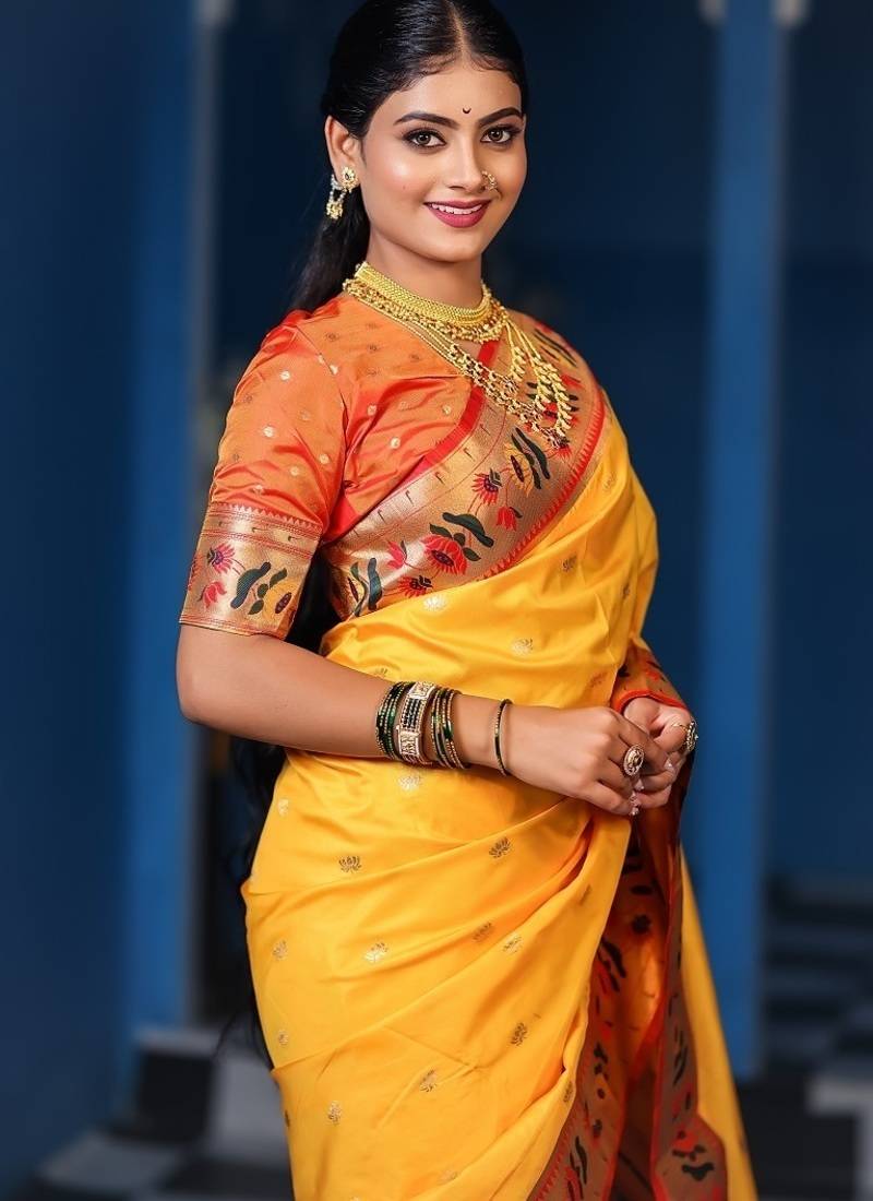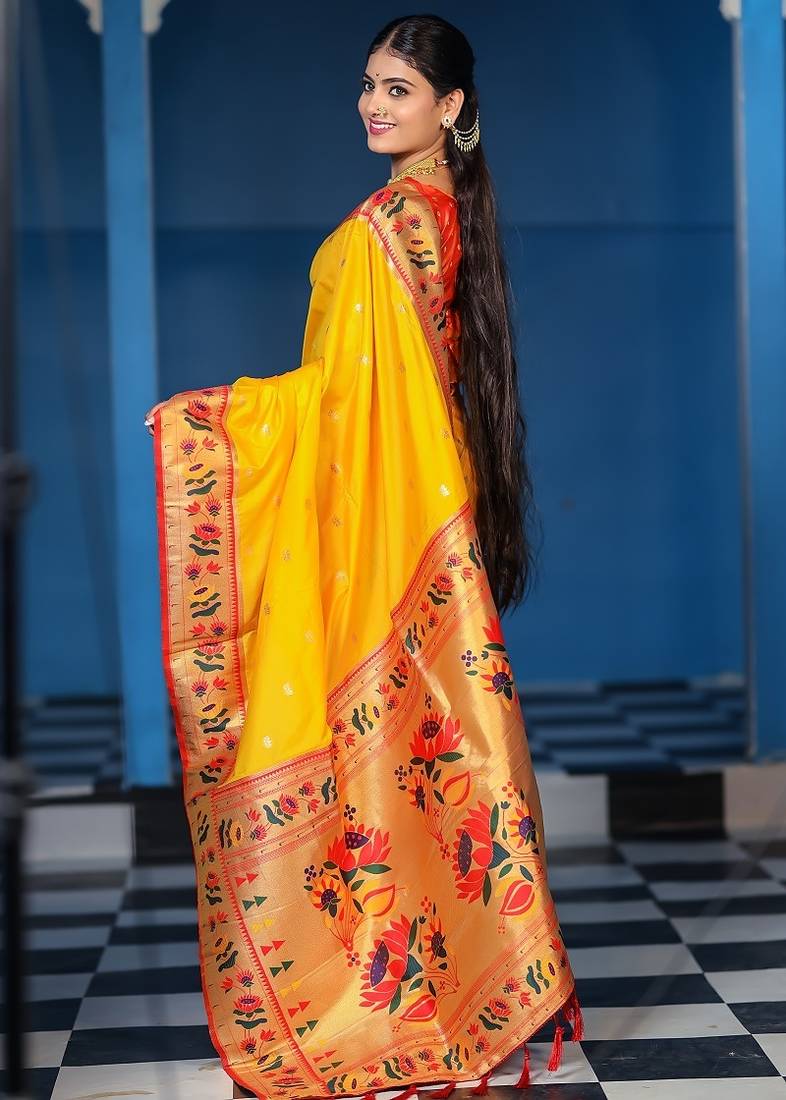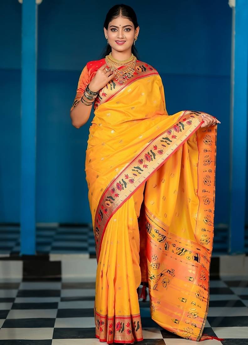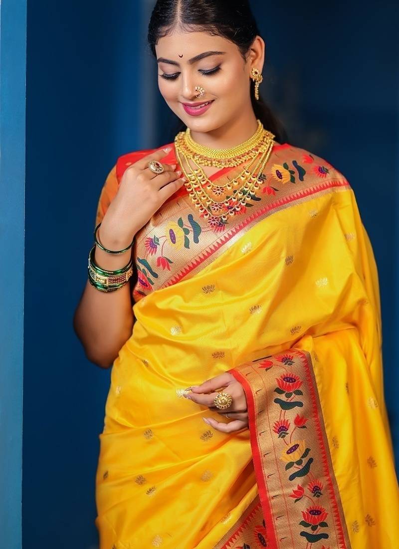 Yellow color weaving paithani gold copper zari weaving meenakari border saree