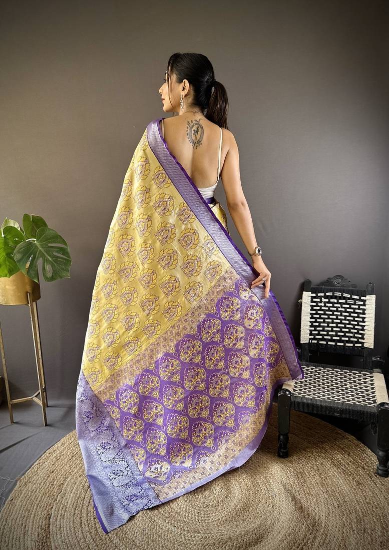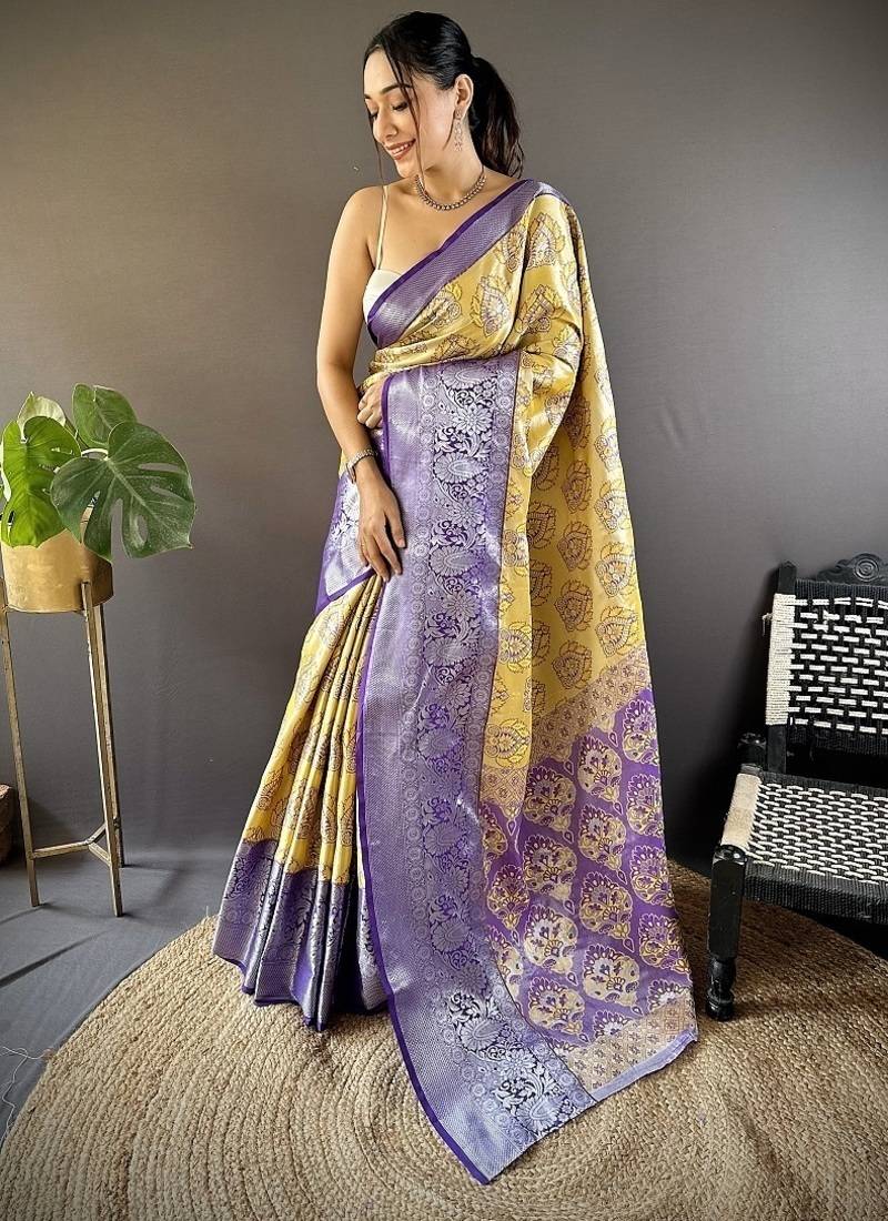 Yellow & purple blue color zari weaving work kanjivaram tissue silk saree