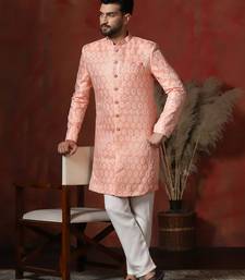 Product Name Peach Jacquard Blend Indo Western And Pyjama Set For Men With Printed Design