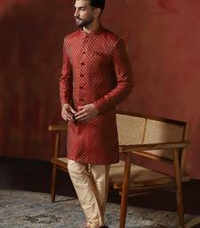 | Product Name | Red Jacquard Blend Indo Western And Dhoti Set For Men With Printed Design | |