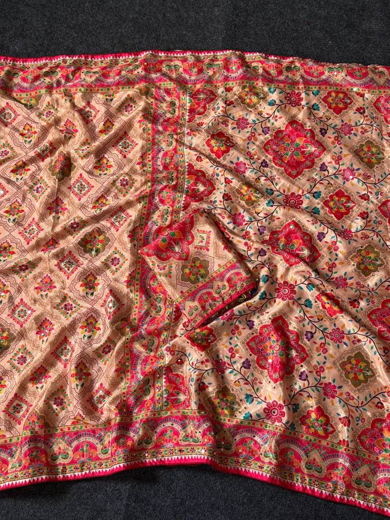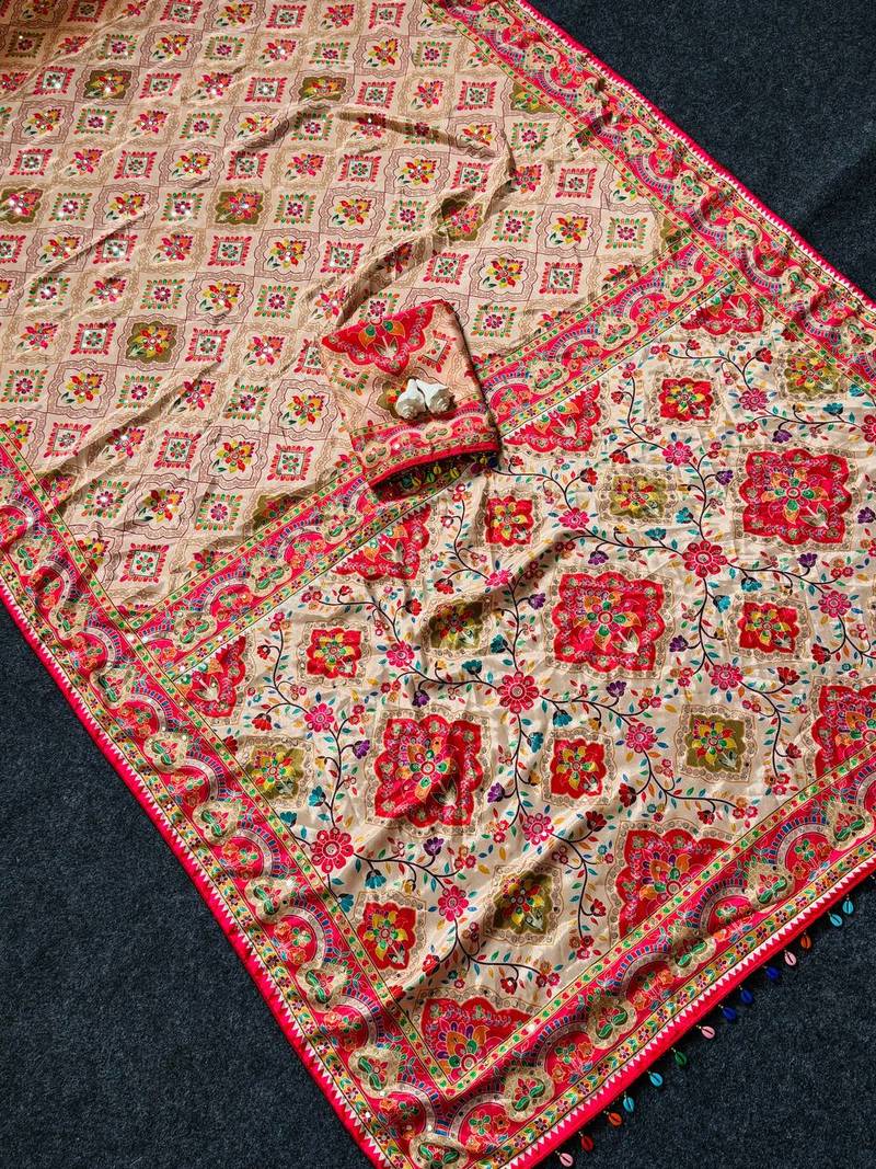 | Product Description | Fabric: Roman Silk With Ajarakh Print And All Saree Real Mirror Work And Piping Saree Border & Pallu Also Kodi Latkan