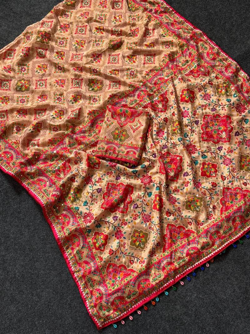 | Product Name | Beige Color Ajarakh Print And Mirror Work And Piping Saree Border Silk Saree | |