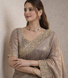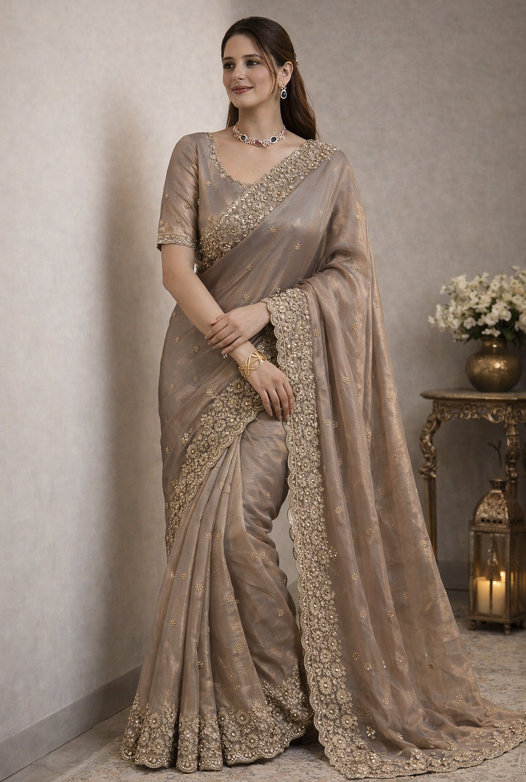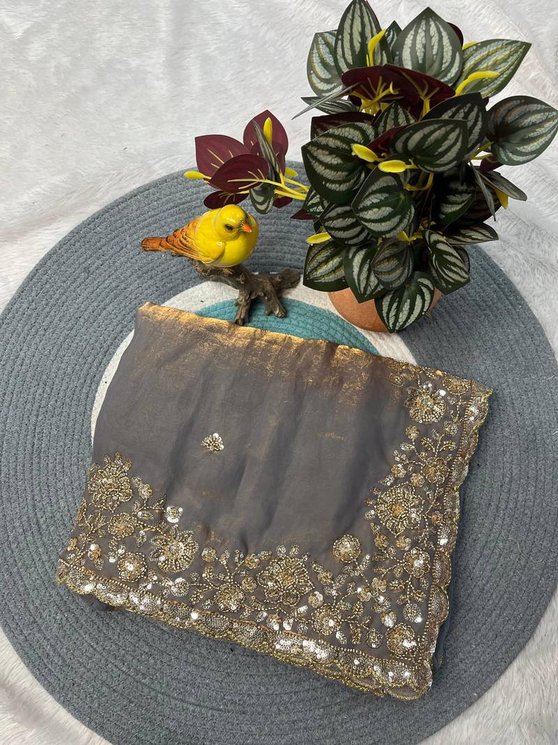 Grey Color Beautiful Embroidery detailling Satin Silk Saree