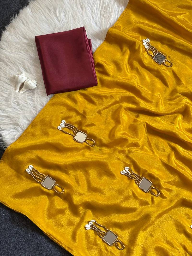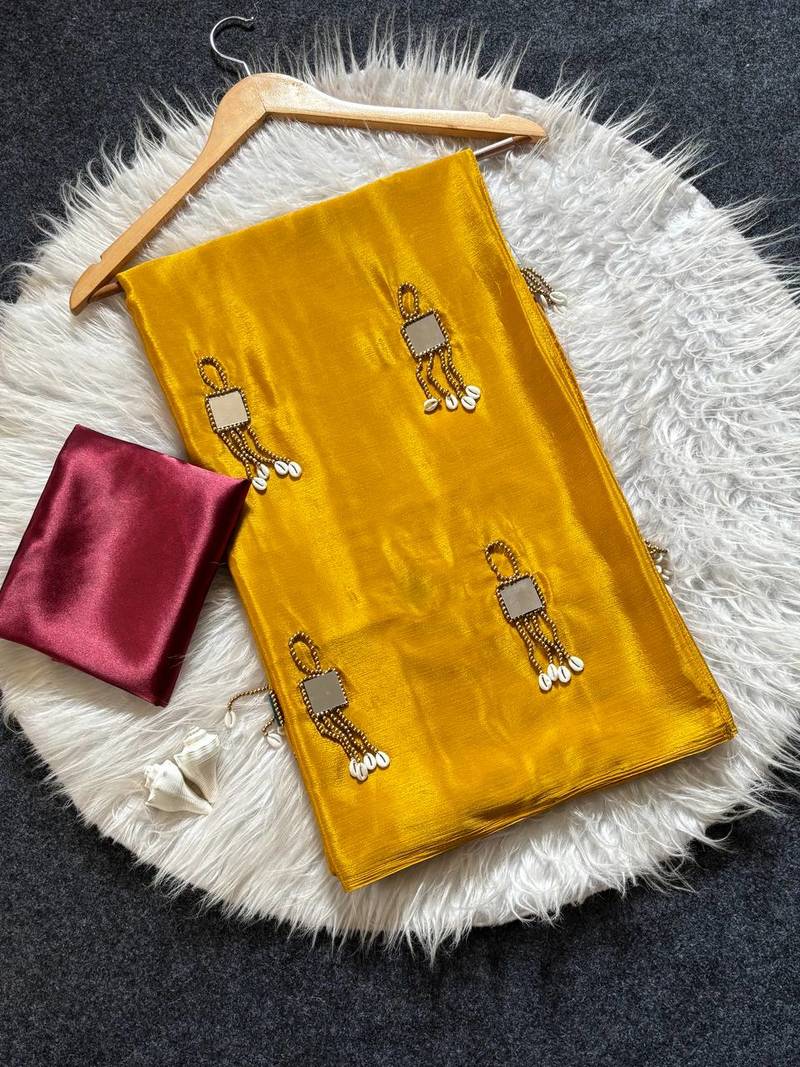 | Product Name | Mustard Color Real Mirror Moti Latkan & Kawdi Work Chinnon Saree | |