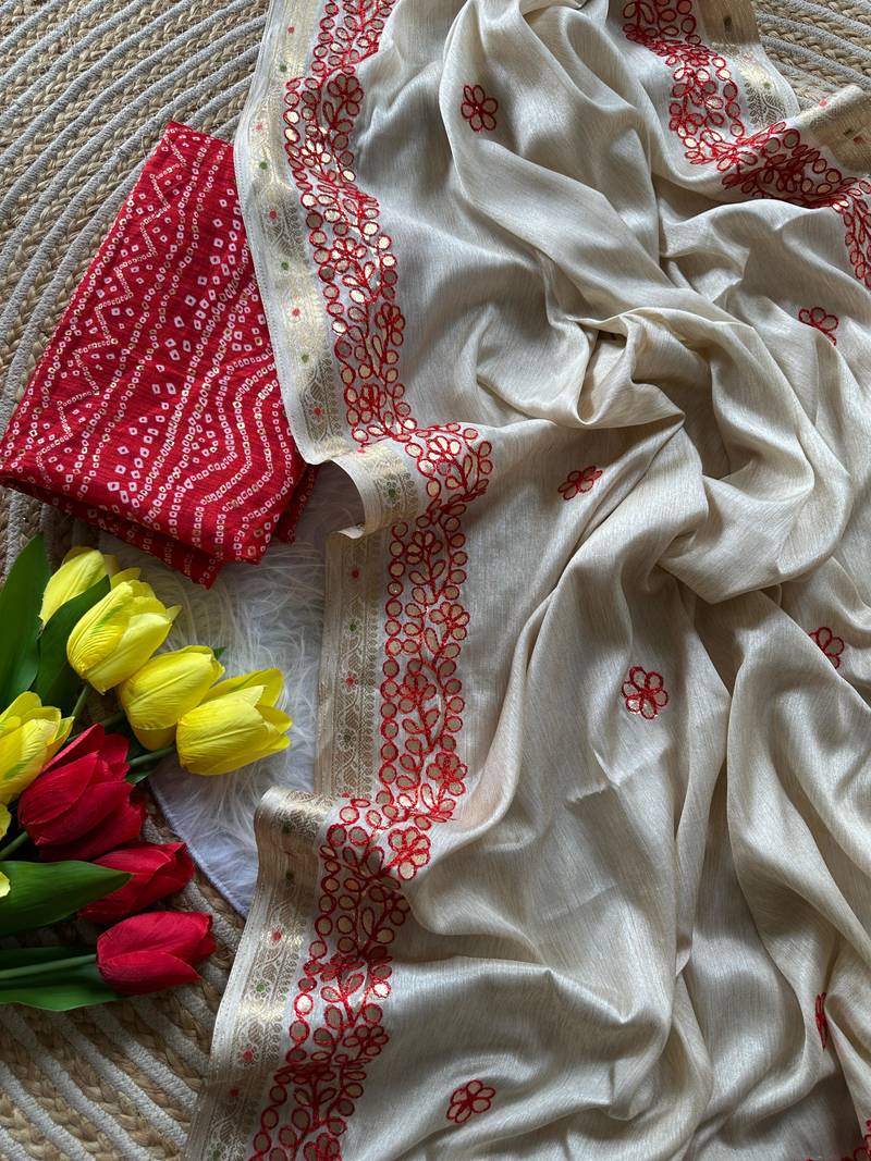 | Product Description | Superb Soft Tusser Silk Fabric With Zari Weaving Border With Beautiful Rajasthani Gotapatti Work In Saree Blouse Beautiful Raw Silk Fabric With Bandhani Print |