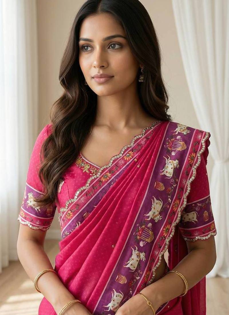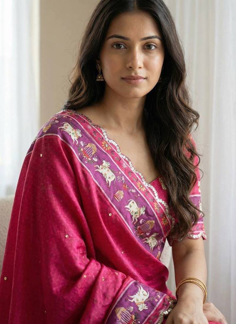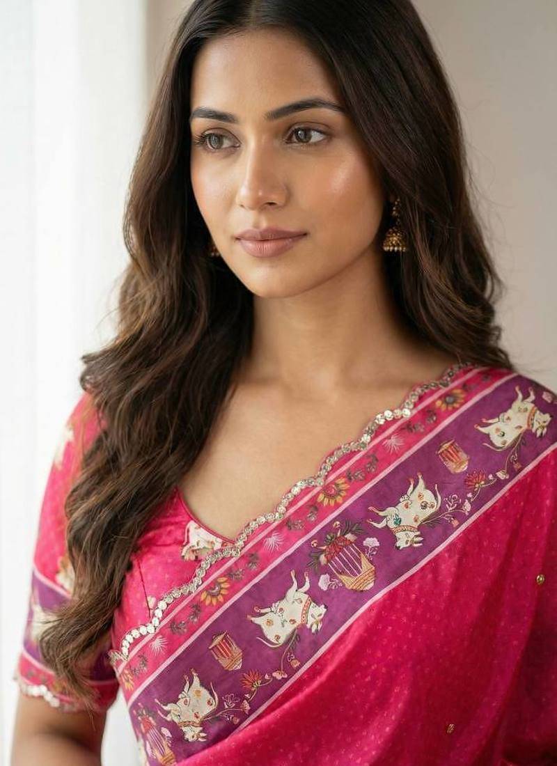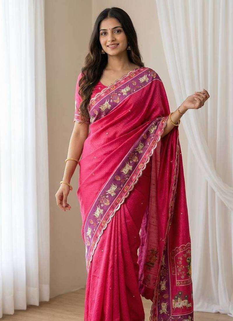 Product Name Pink Color Aaari Mirror Foil Work And Gopi Kana Print Silk Saree
