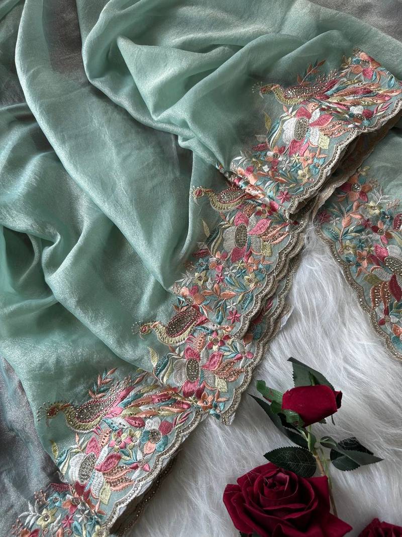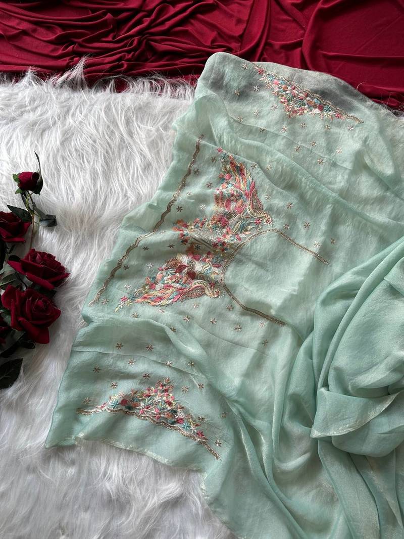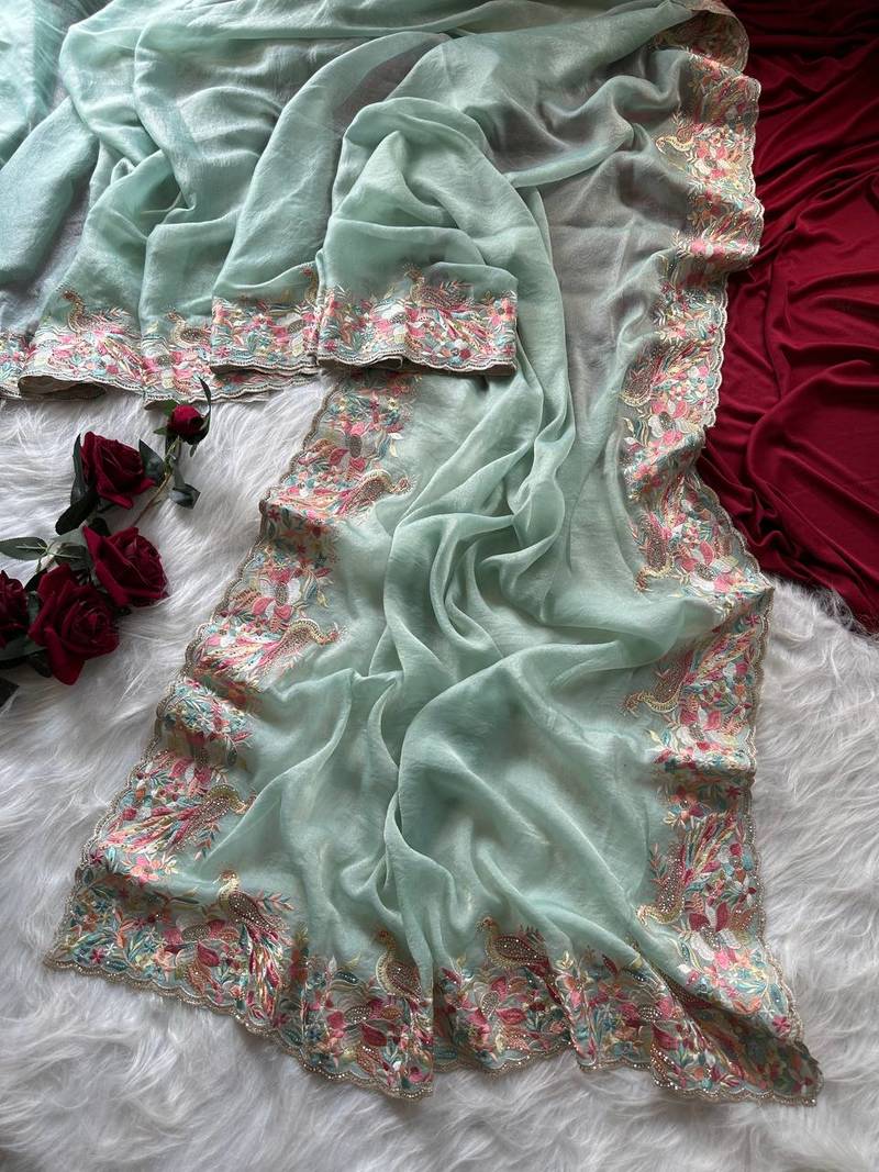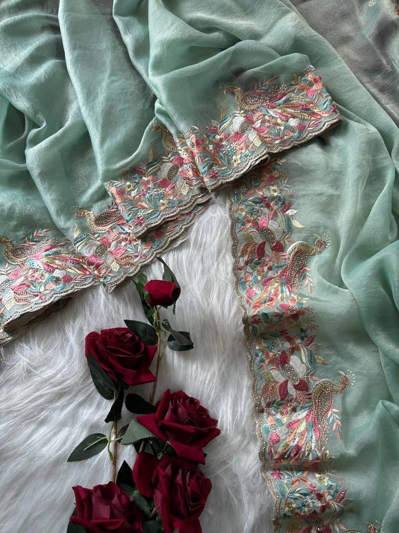 Teal color embroidery with beautiful peacock & floral motifs work moss chiffon saree