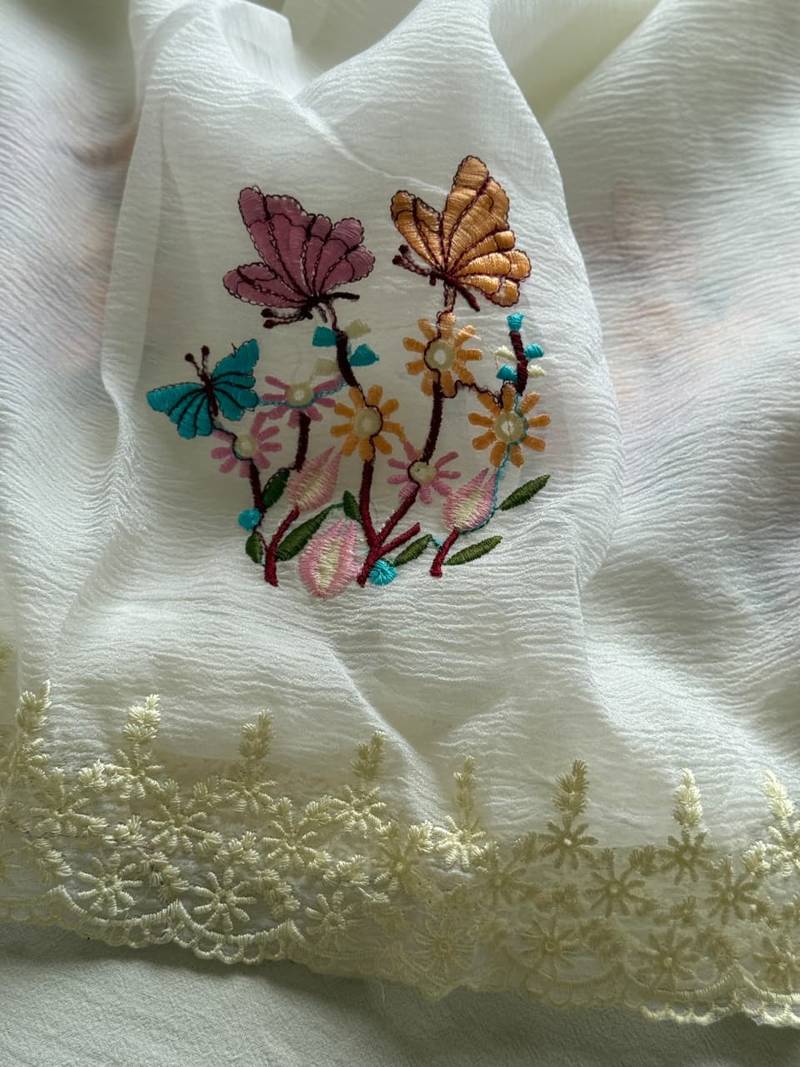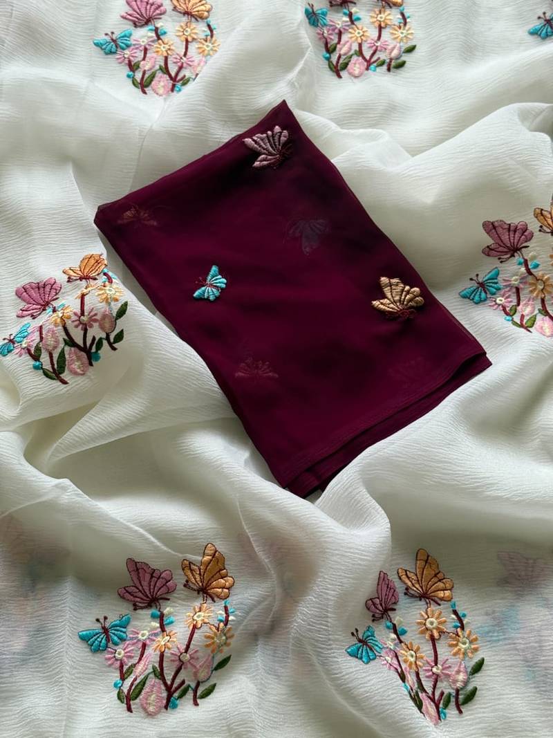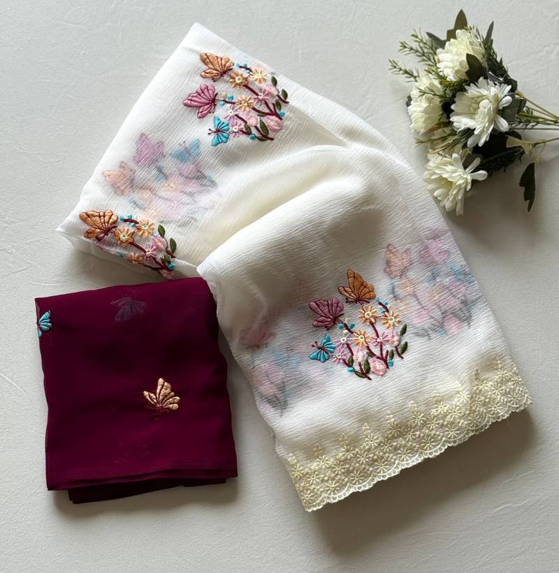 White color embroidered crush georgette chiffon saree