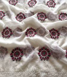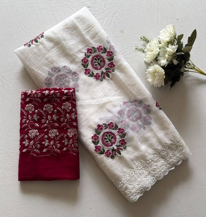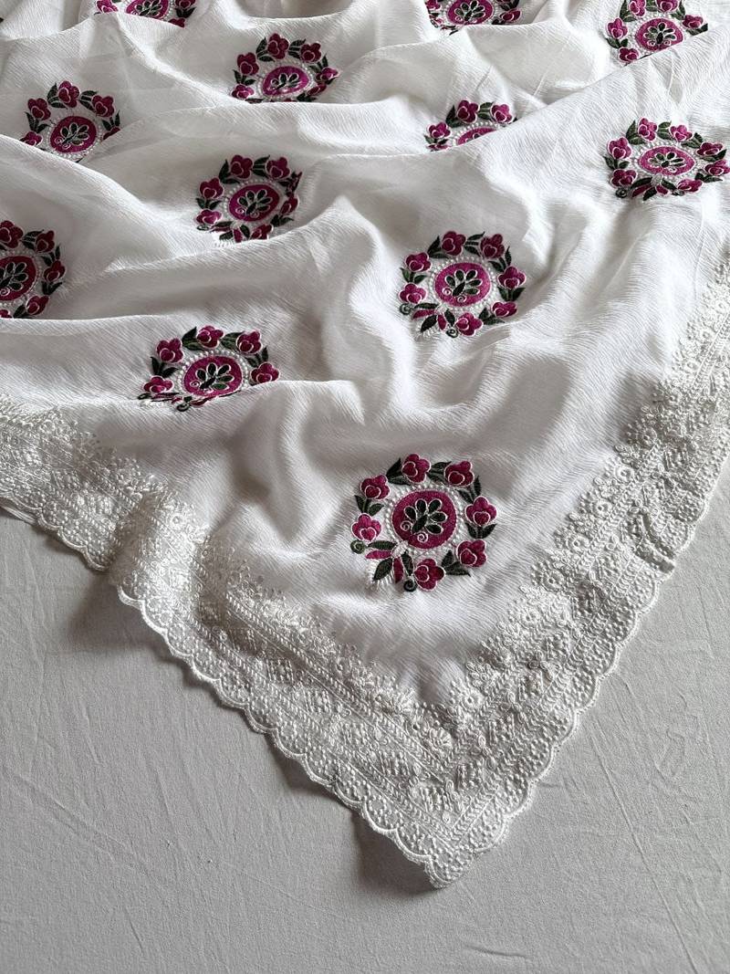 | Product Description | Pure Crush Georgette Chiffon Saree With Premium Floral Embroidery All Over The Saree With Scallop Embroidery Border Blouse: Contrast Lucknowi Sequence Embroidery Blouse. |