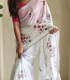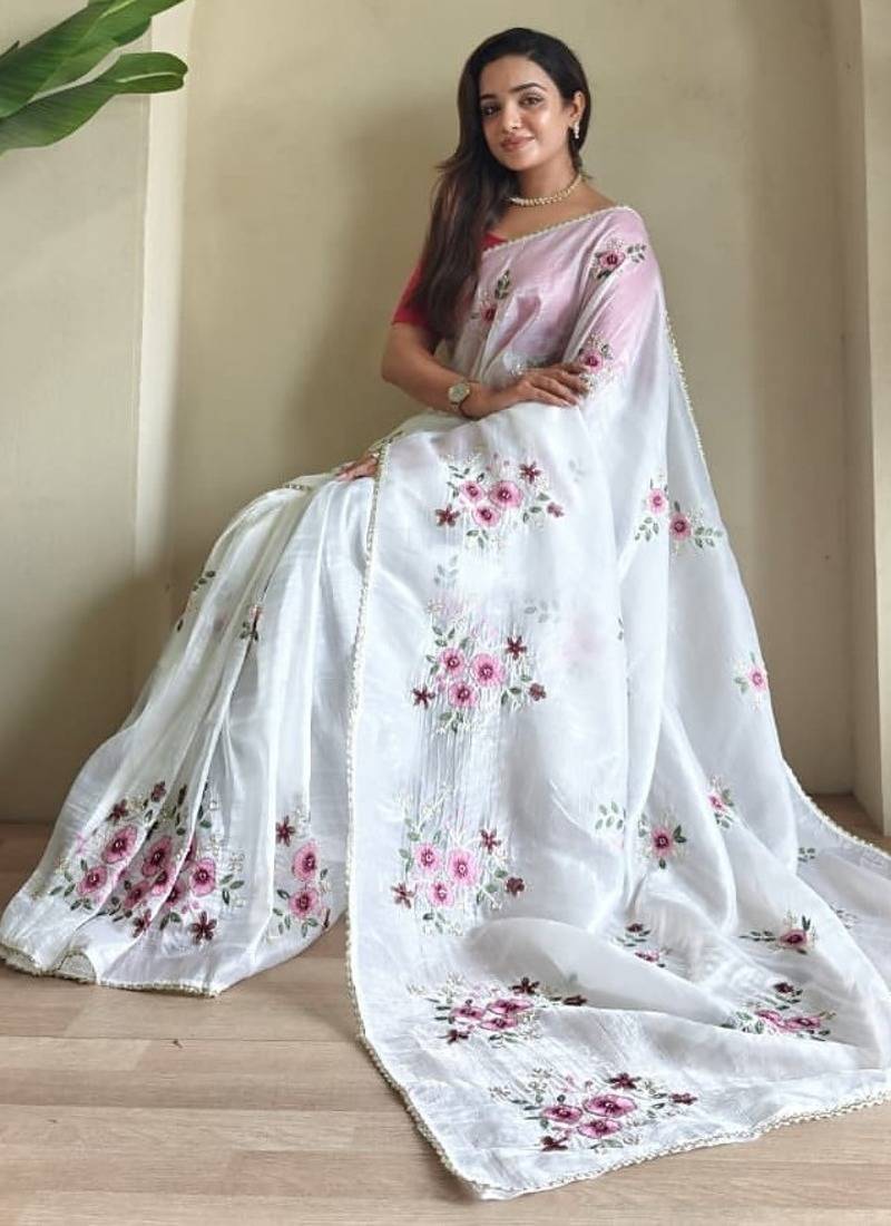 White color flower embroidory work tissue saree