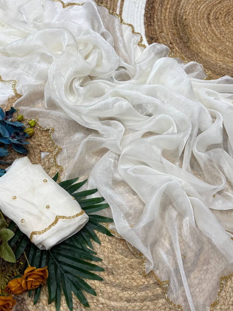 | Product Name | White Color Khatli Beads & Moti Handwork Chiffon Silk Saree | |