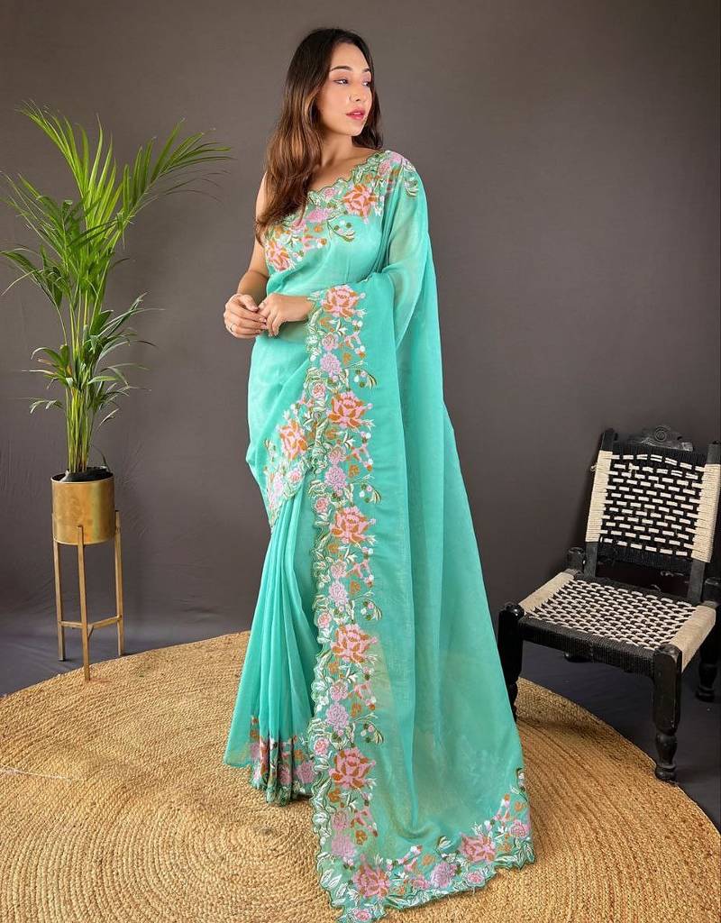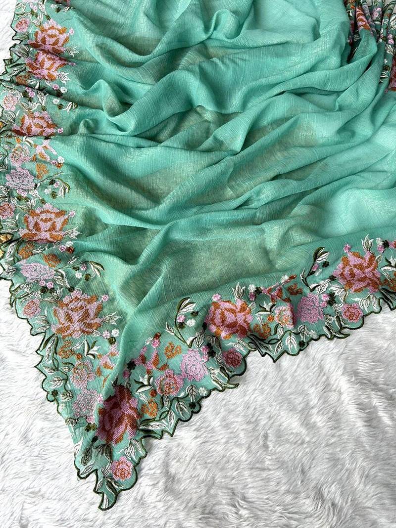 Aqua color cross stich floral design embroidery work cut work glossy silk saree